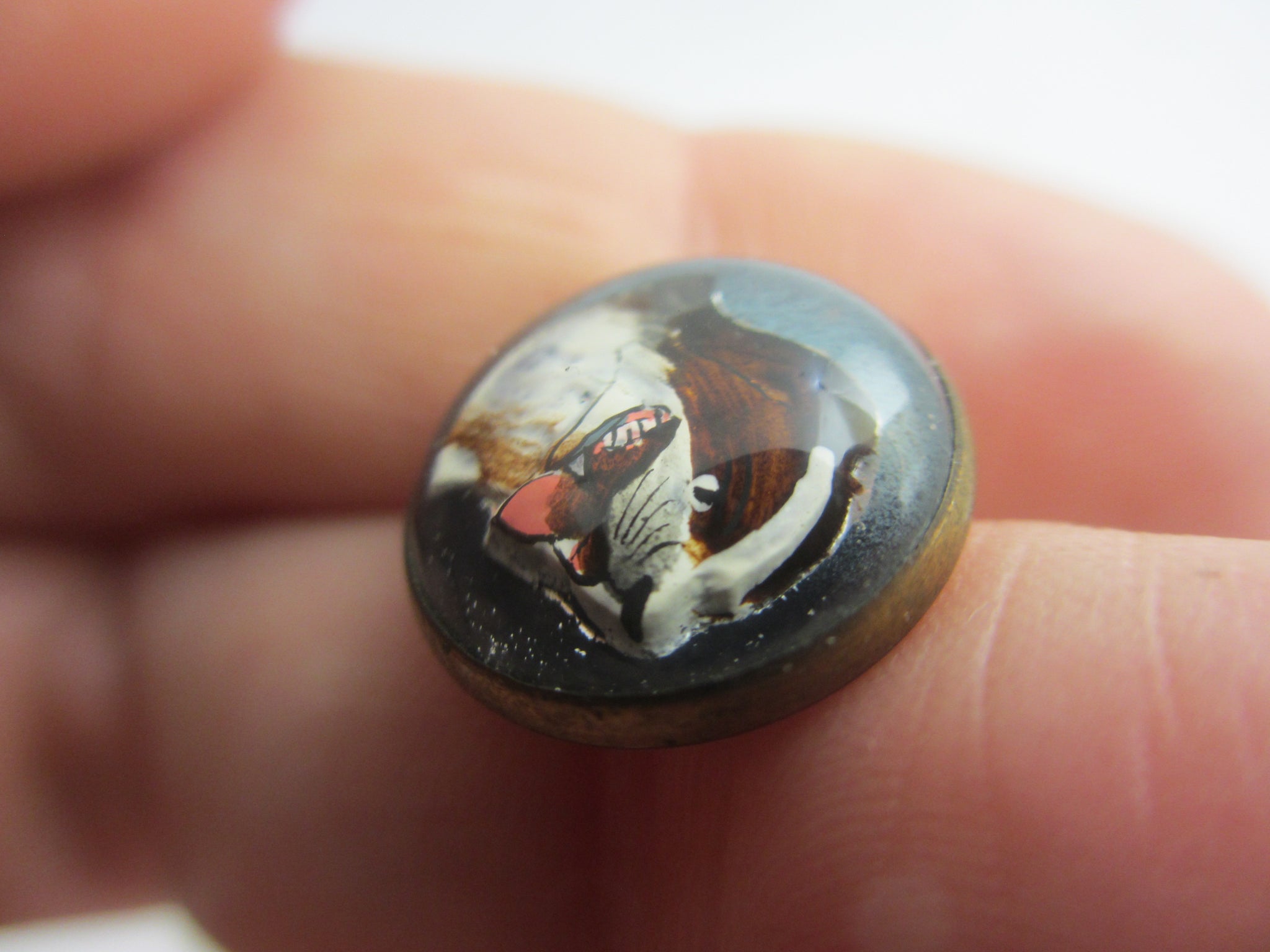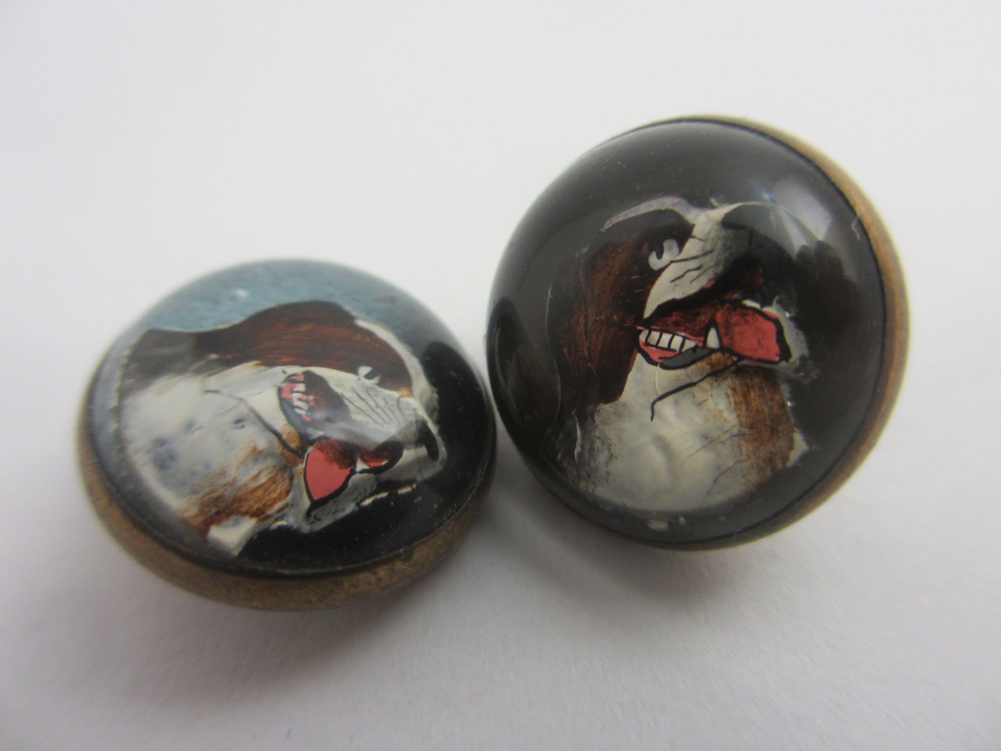 Spaniel Dog Essex Crystal Reverse Painted Intaglio Pair of Brass Buttons Antique Edwardian