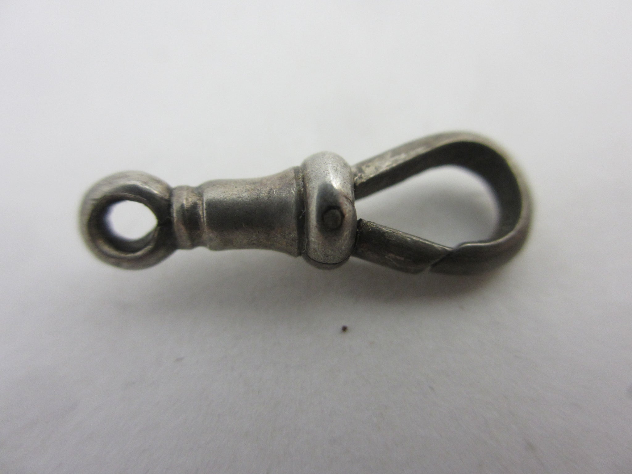 Traditionally found attached to the end of a gentleman's Albert watch chain, but today used to secure a bracelet or necklace, this is a great secure antique sterling silver dog clip clasp dating from the late Victorian period. The silver has been tested as there are no marks, good secure clasp with a good spring. The clasp does not spin on the bale.