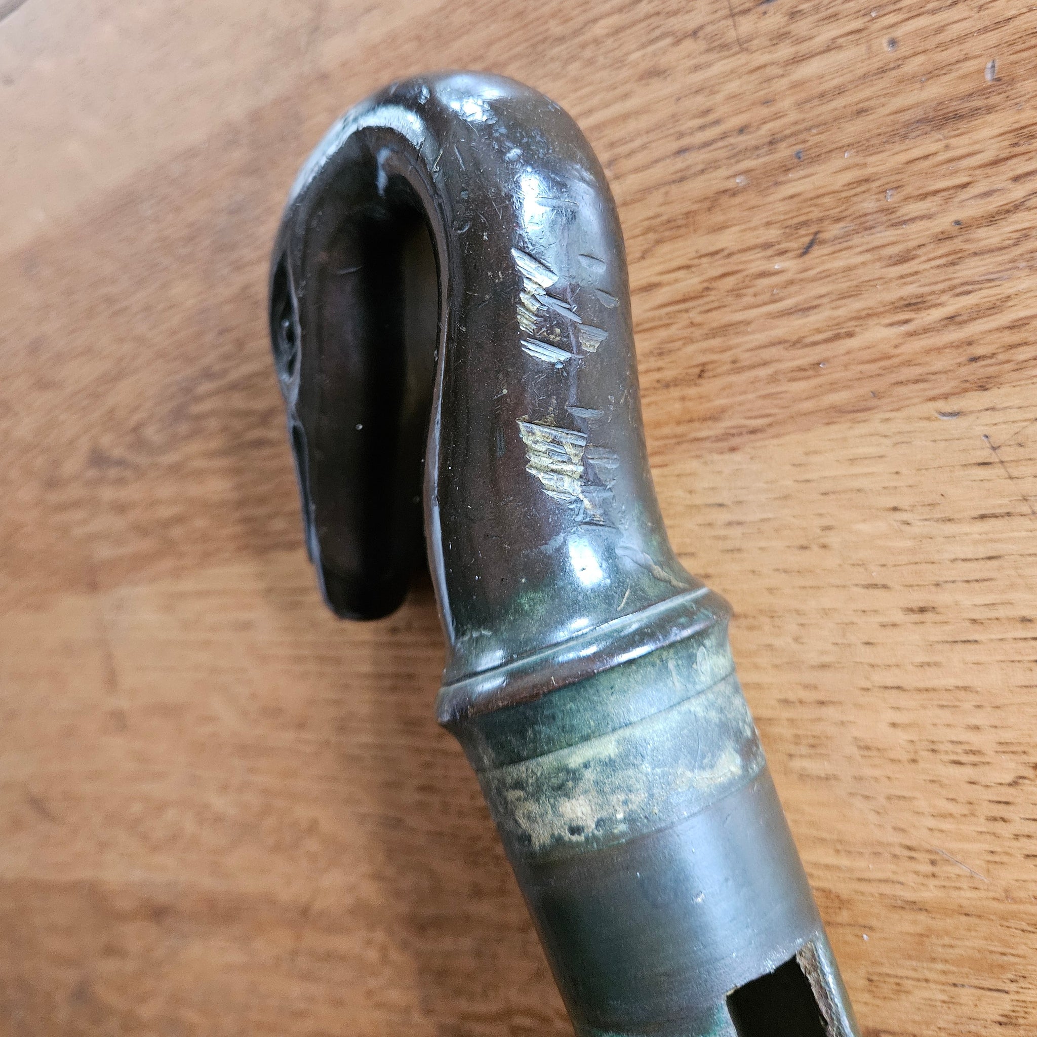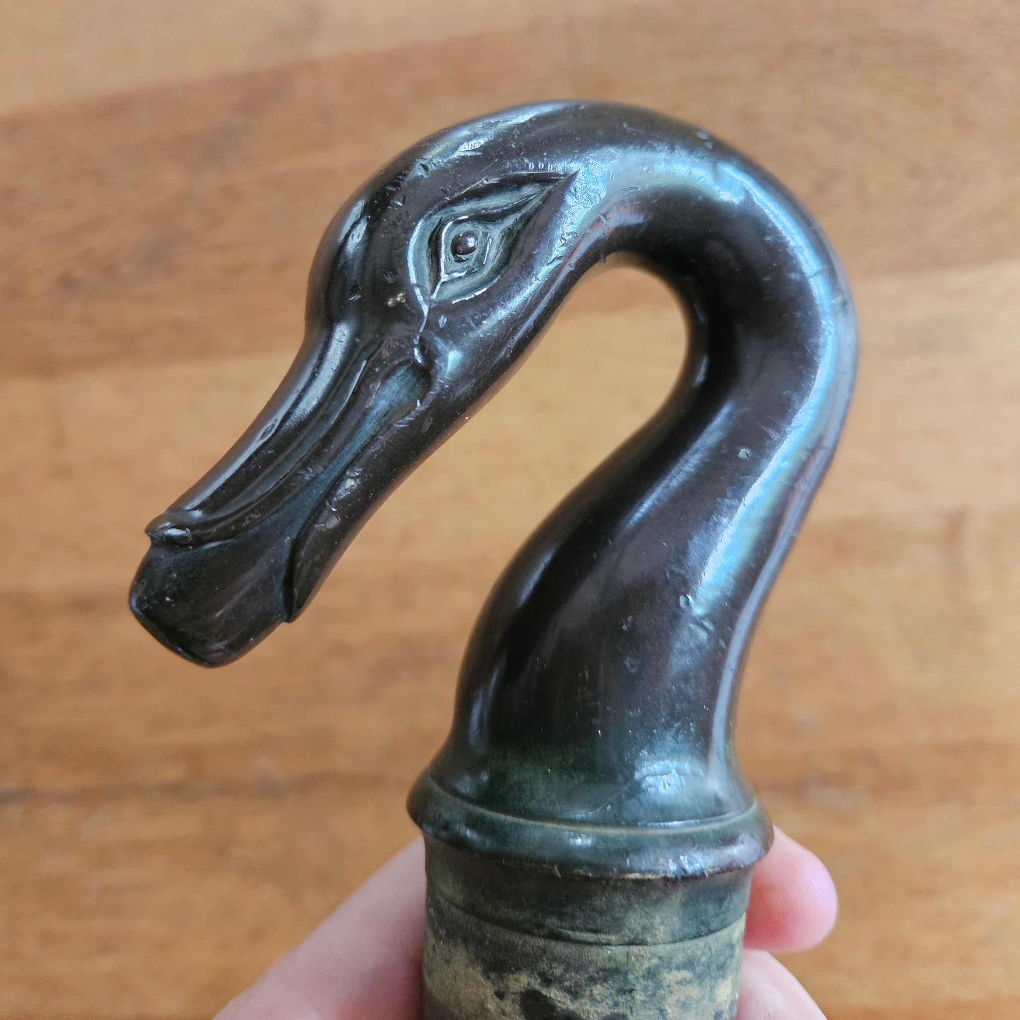 A striking 19th-century French bronze handle crafted in the form of a duck, swan, or stylised bird with distinctive facetted detailing. This ornamental piece exemplifies the refined metalwork of the period, featuring elegant proportions characteristic of French decorative arts. There are some scratches to the rear of the head, please see the pictures. Likely sourced from a piece of furniture, architectural fitting, or decorative object, this bronze casting showcases the skilled craftsmanship typical of 19th-century French bronziers. A wonderful addition for collectors of antique metalware, French decorative arts, or those restoring period furniture. The patina reflects its age and authenticity.