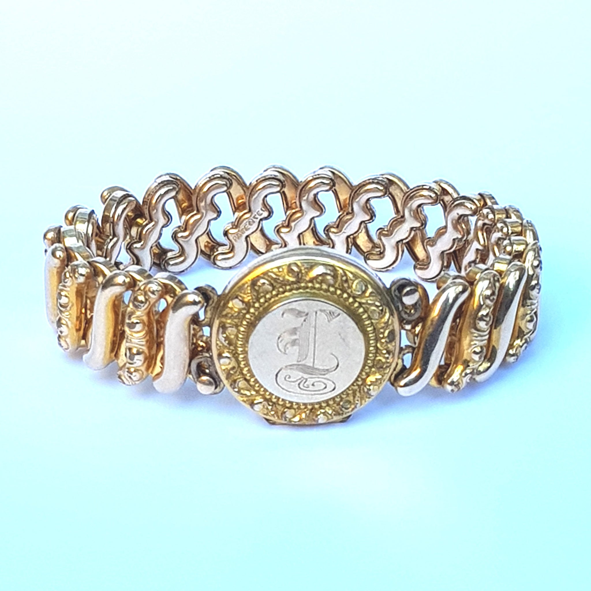 Antique Early 20th Century American Manufactured 10k rolled gold Keepsake Locket (or poison locket) Concertina Shank Bracelet, the Keepsake Locket feature being the setting to the bracelet in the form of a roundel drum with hinged clasp for opening and closing as with an earlier Victorian design which is engraved to the lid with the letter 'L' in an ornate, turned font.