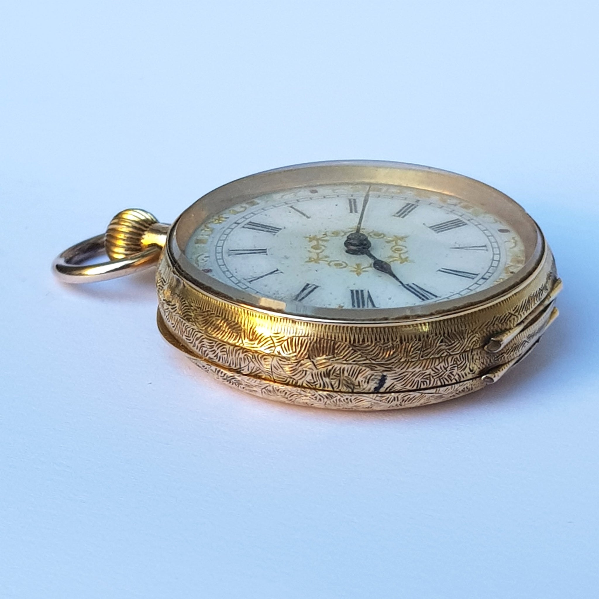 Swiss 14k Gold Cased Ladies Floral Detailed Top Winding Fob Watch Antique Victorian Circa 1890's