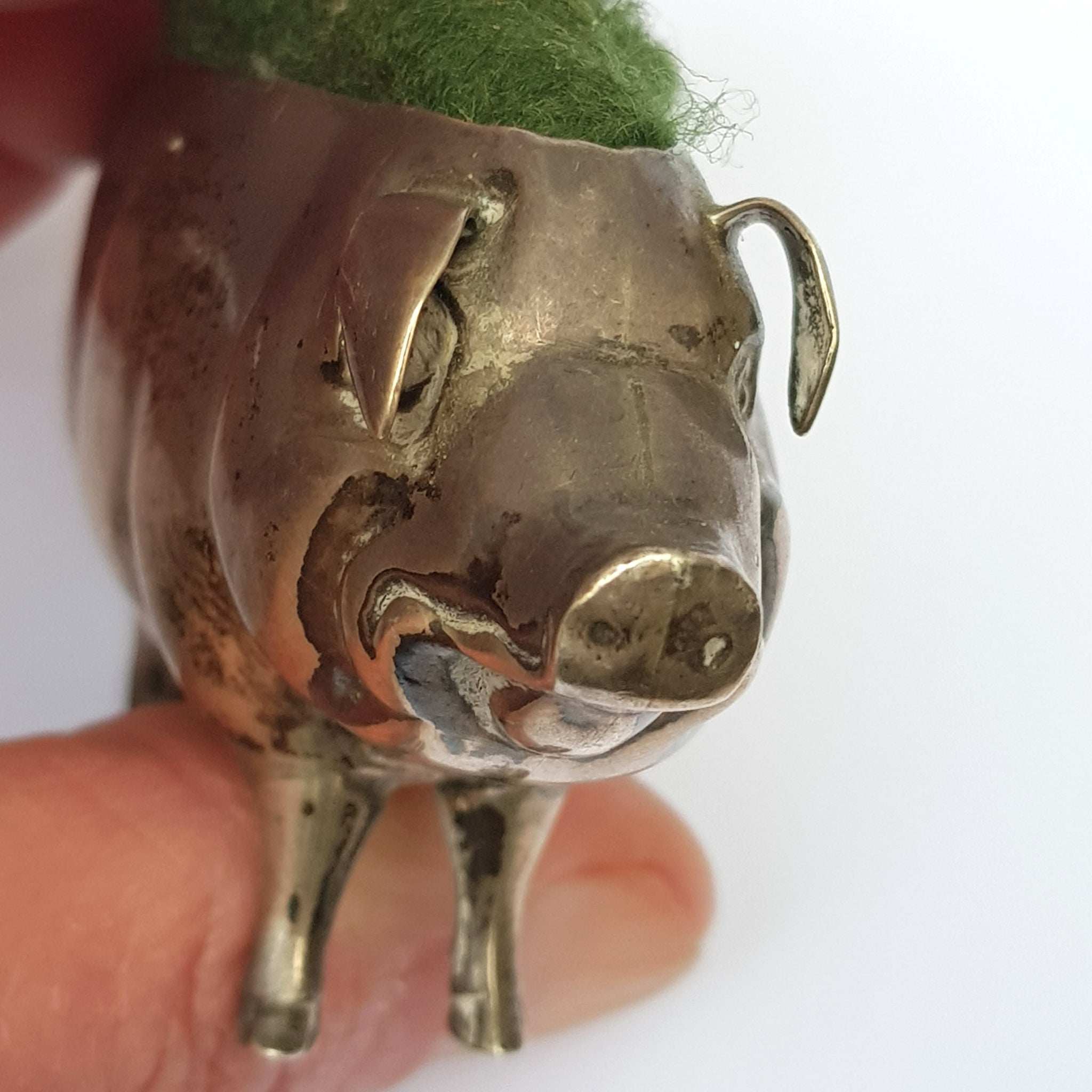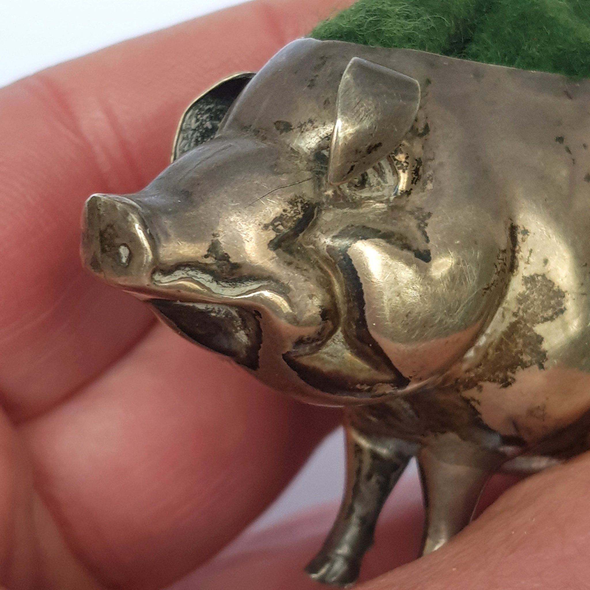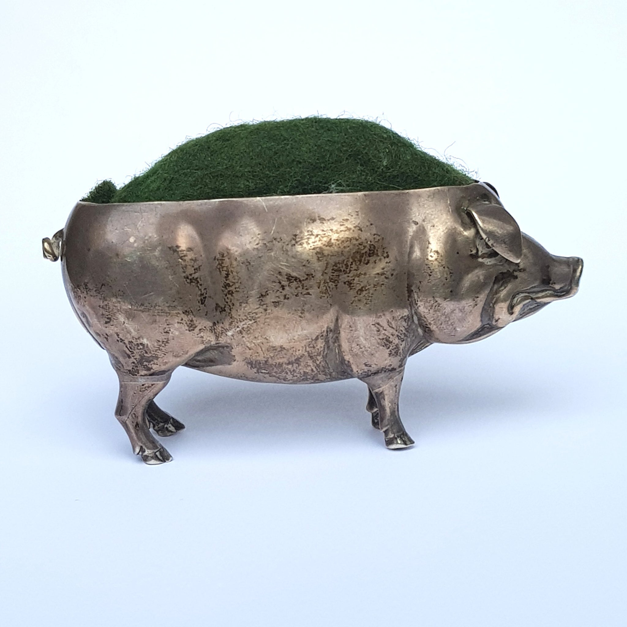 In good condition for age but showing some wear commensurate with handling and use over the years the back to the pig retains fitted and padded green velvet cushion, somewhat worn but the the silver construction to the pin cushion is without dings, splits, damage or repairs but as can be seen from the photographs will benefit from a gentle clean and polish as tarnishing is present from age.