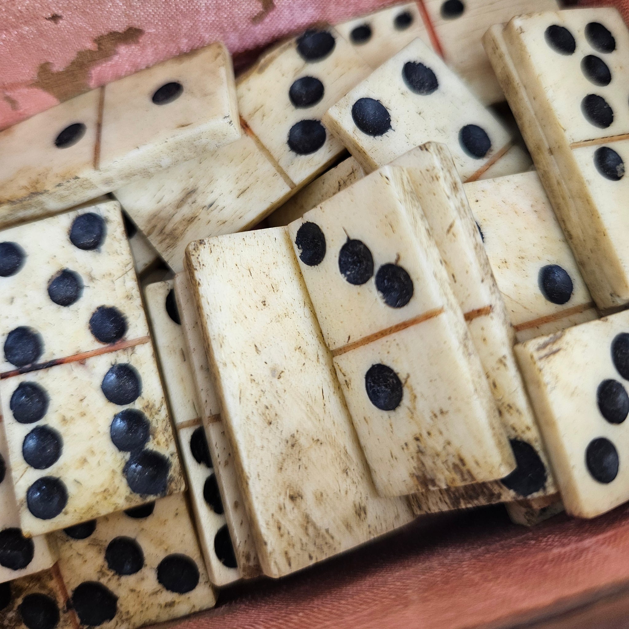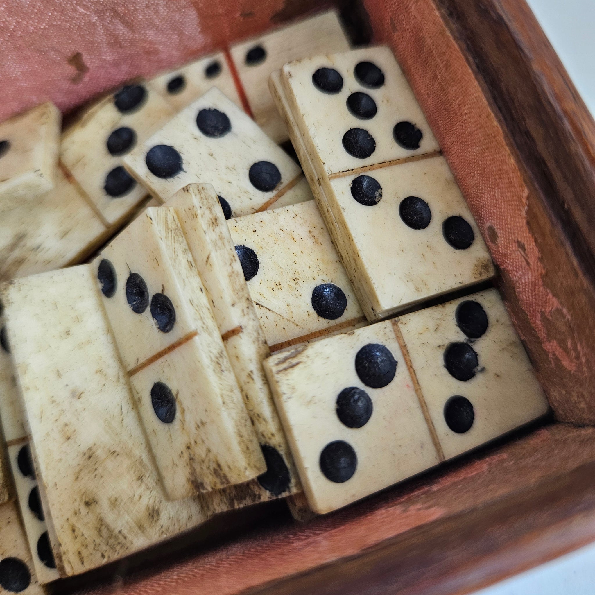 A remarkable Georgian-era domino set crafted by Napoleonic prisoners of war, circa 1820. This exceptional piece combines finely carved bone tiles with rich mahogany casing, showcasing the remarkable craftsmanship and ingenuity of captive artisans during the Napoleonic Wars. The set features intricately detailed bone dominoes, each pip precisely carved and inlaid. The mahogany box displays the period's elegant joinery and finish, with a fitted interior designed to house and protect the complete set. The contrast between creamy bone and deep mahogany creates striking visual appeal. Prisoner of war craftsmanship represents a poignant chapter in history—these items were often created during internment as both practical pastimes and valuable trade goods. This domino set exemplifies the skill and dedication these craftsmen brought to their work, making it a treasured collectible for those interested in Georgian antiques, gaming history, and Napoleonic-era memorabilia. A functional piece of history in excellent condition, suitable for display or occasional play. An authentic conversation piece that connects you to an extraordinary period of craftsmanship and human resilience.
