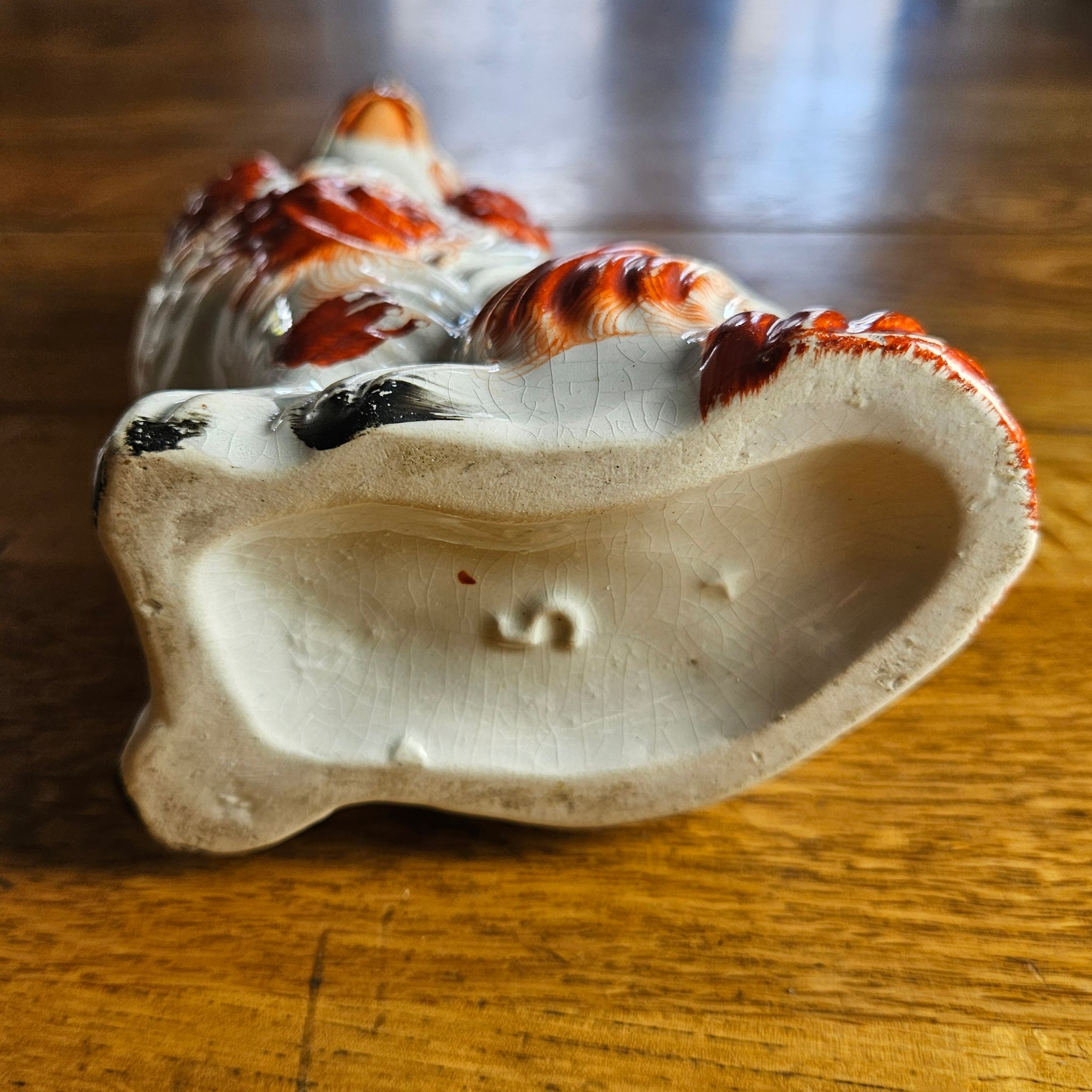 A charming Victorian-era Staffordshire pottery spaniel, hand-crafted circa 1860. This delightful Cavalier King Charles features the distinctive iron red glazing characteristic of the period, with beautifully detailed curly coat work. Marked size 5 to the base, it captures the warmth and personality typical of 19th-century Staffordshire dog figures. A wonderful example of English ceramic craftsmanship, perfect for collectors of antique pottery or those seeking an authentic period piece with genuine historical character.