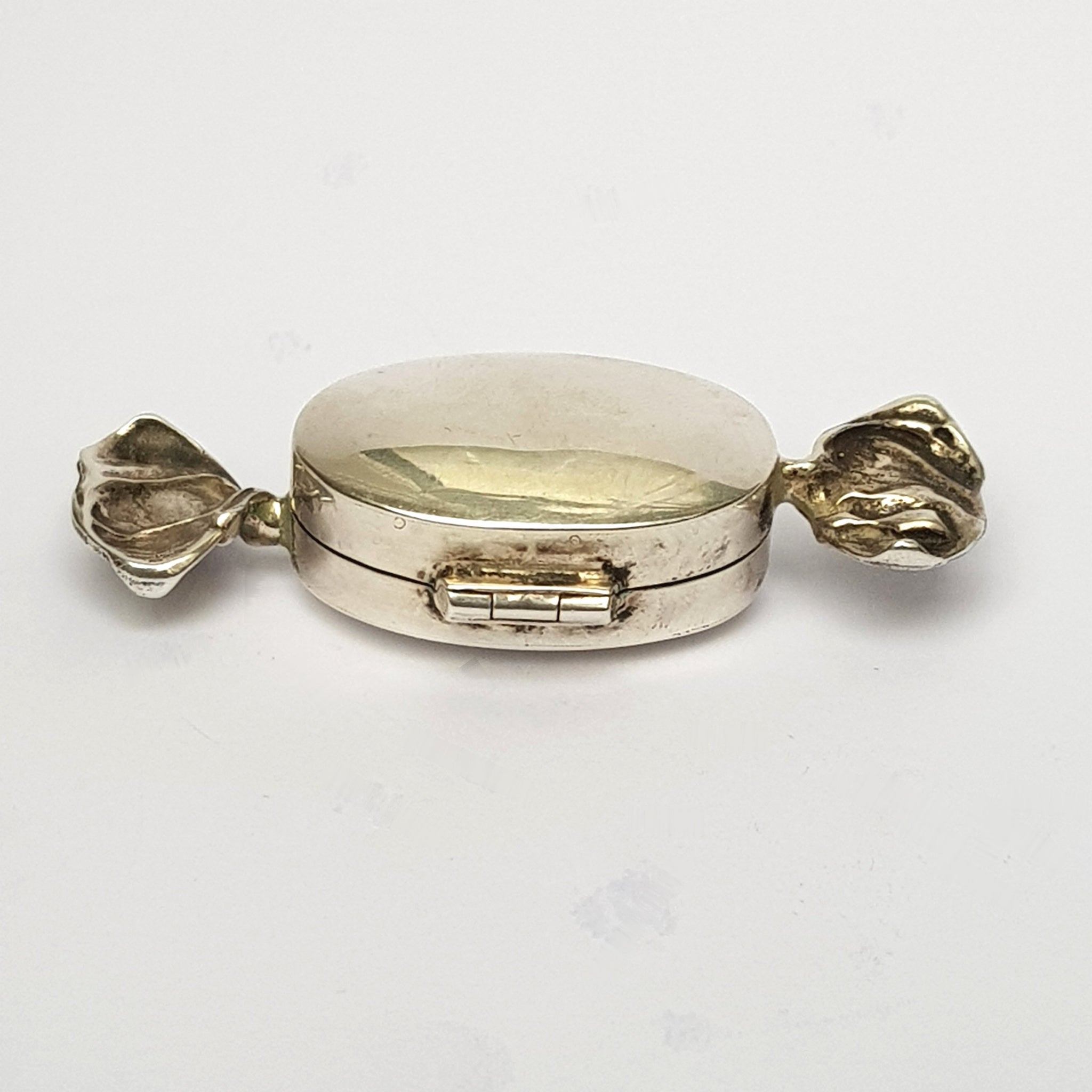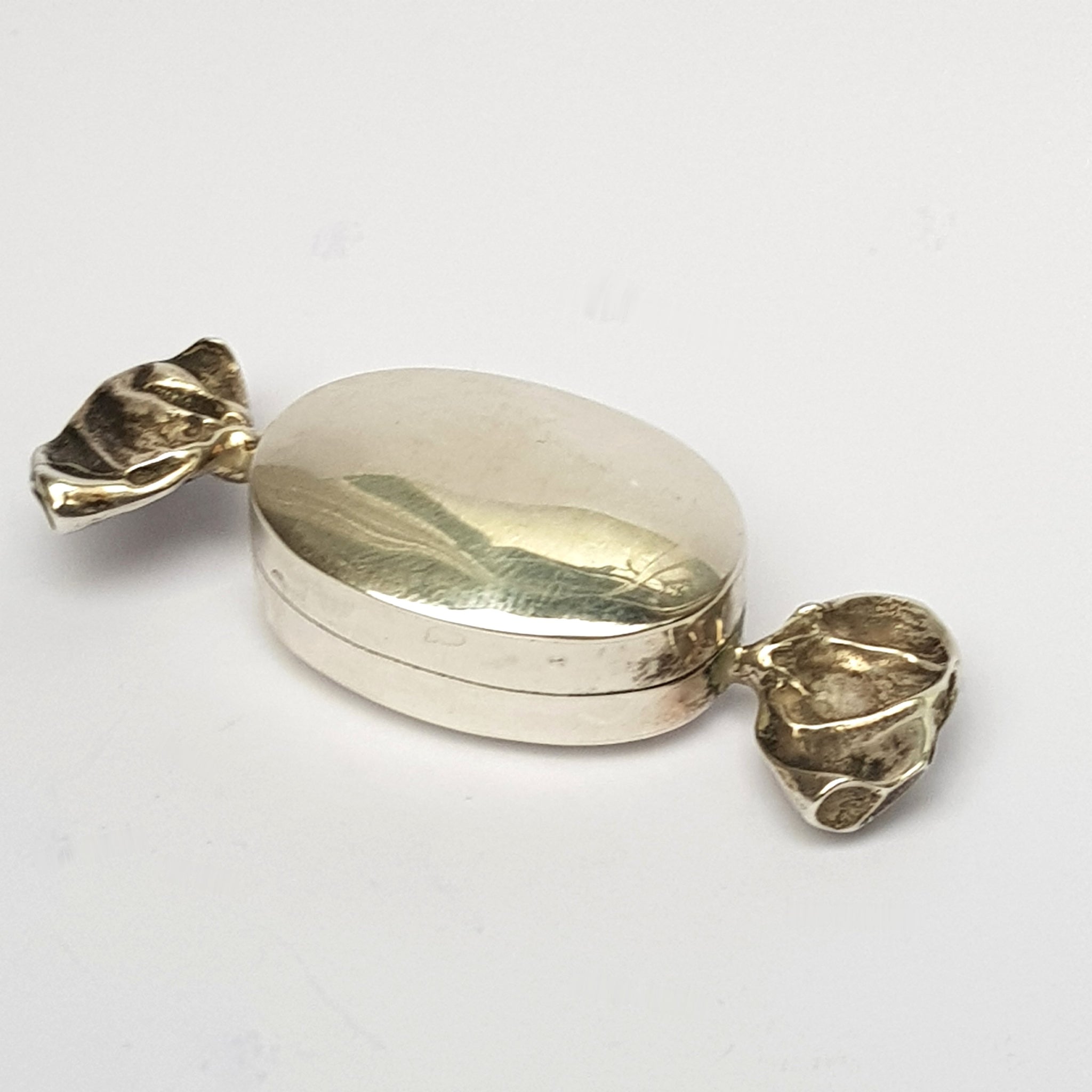 Vintage Latter 20th Century Lovely Quality Novelty Pill Pot in the form of a Wrapped Sweet or Candy, manufactured in Sterling Silver the item features a strong hinged lid that opens to reveal and interior for storing desired items, be it pills or otherwise.