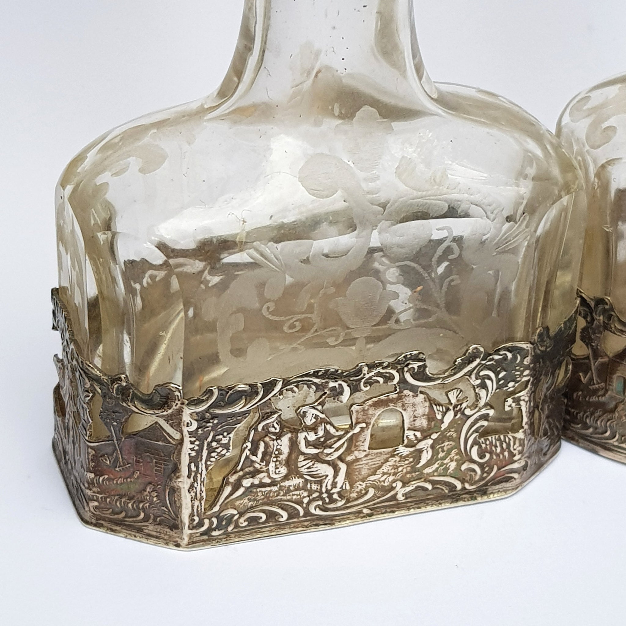 Antique Early 20th Century Top Quality Rare Matched Pair of Dutch Export Sterling Silver Mounted, Facet Cut and Foliate Etched Glass perfume Bottles caged to the foot of each with a traditional colonial scene in pierced and fret worked repousse detail, the collar to each bottle being finished with a floral relief patterning terminating with original cork mounted bottle stopper in the form of a three dimensional Putti wearing a loin cloth.