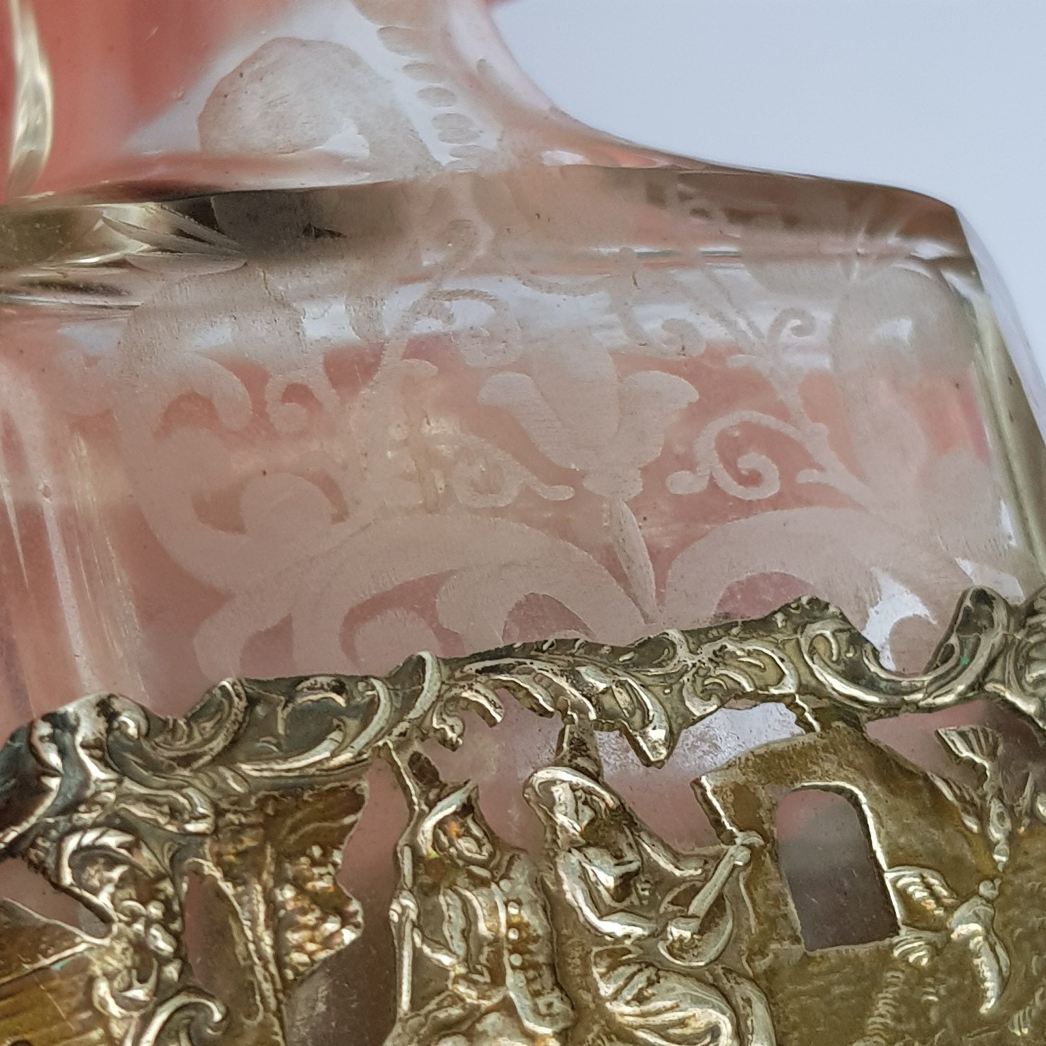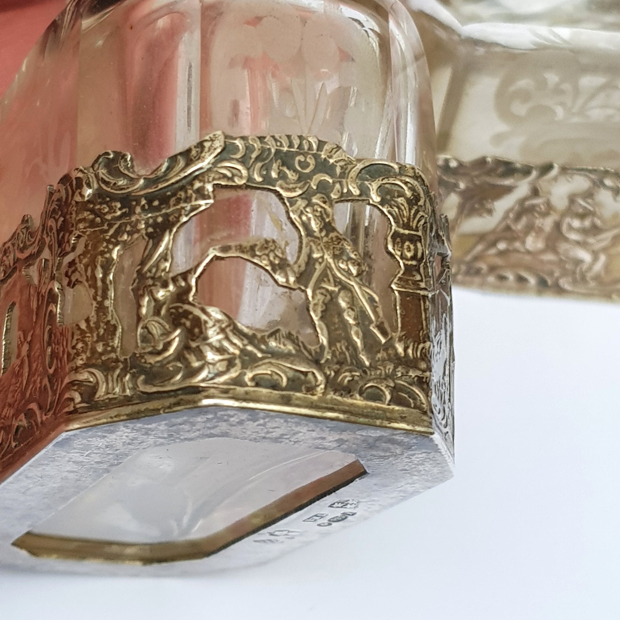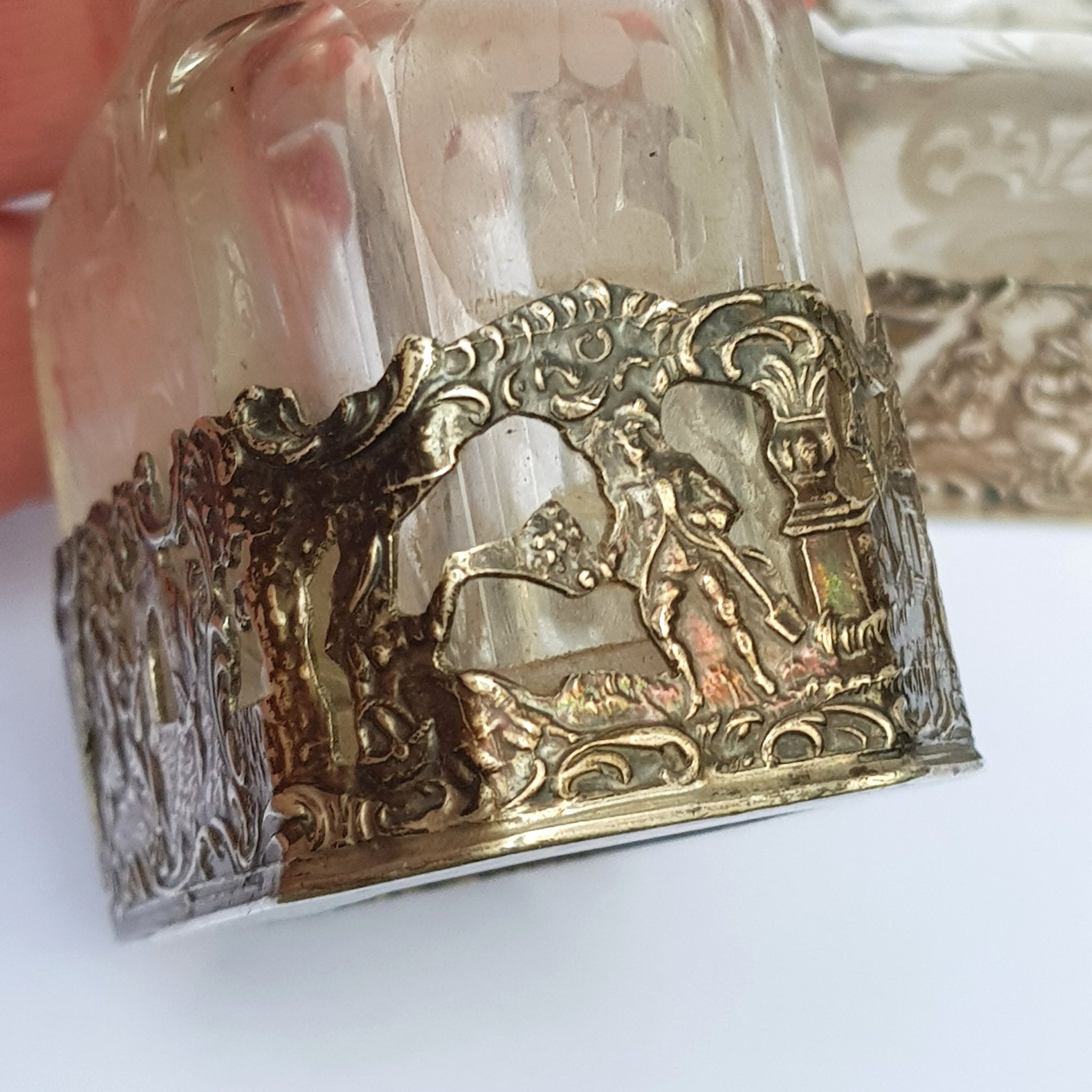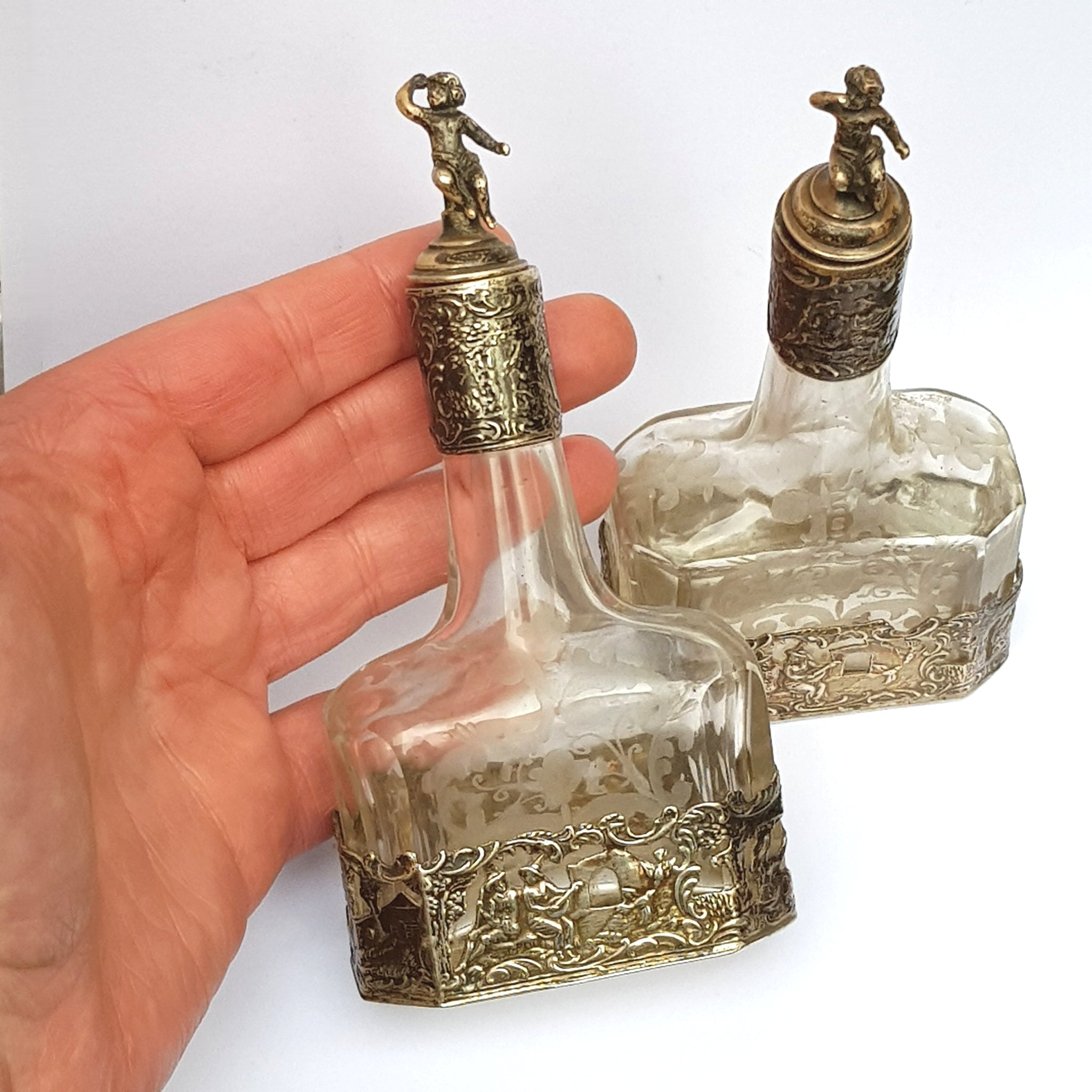 Dutch Sterling Silver Mounted Rare Pair Of Etched And Cut Glass Cherub Stoppered Perfume Bottles Antique Chester Import Circa 1913