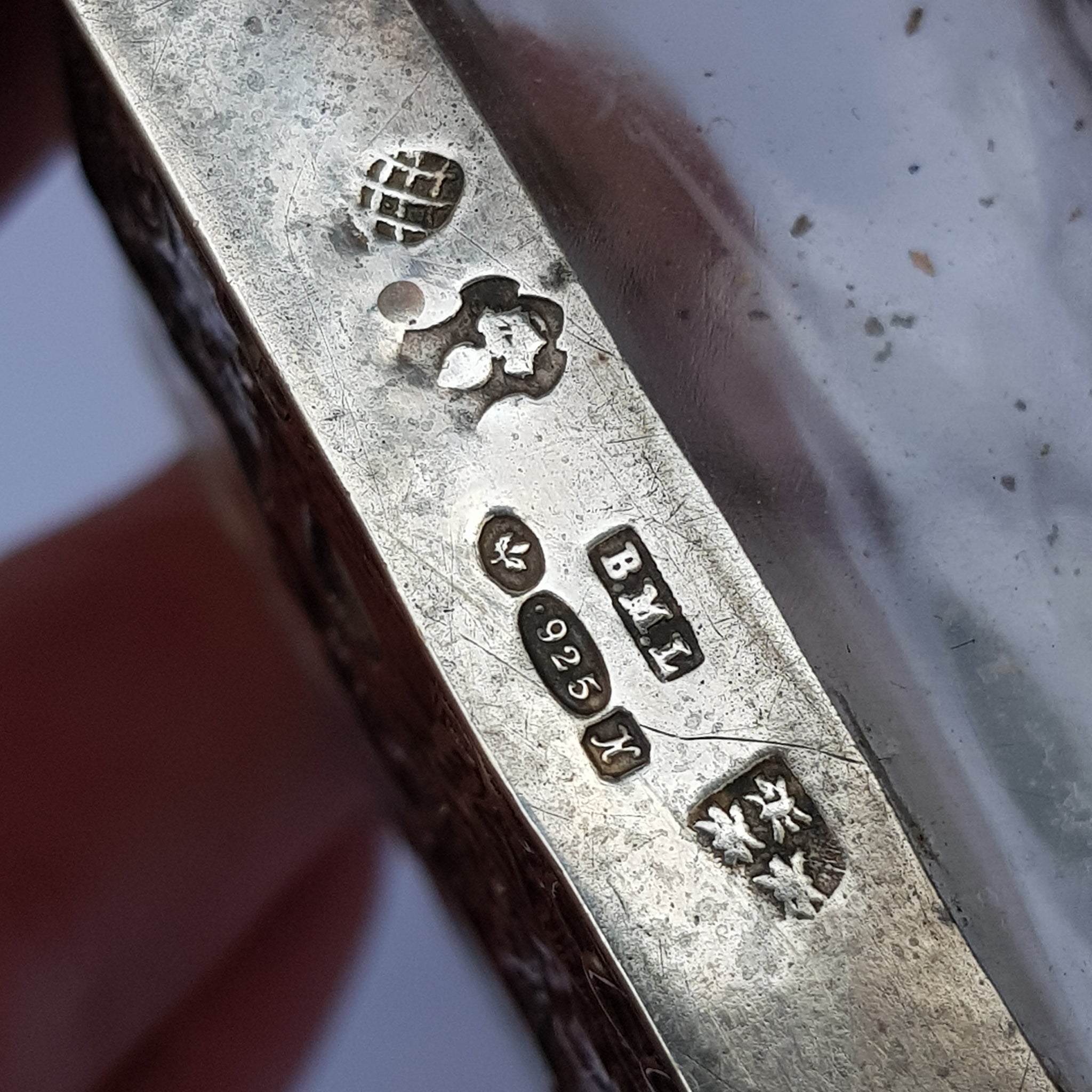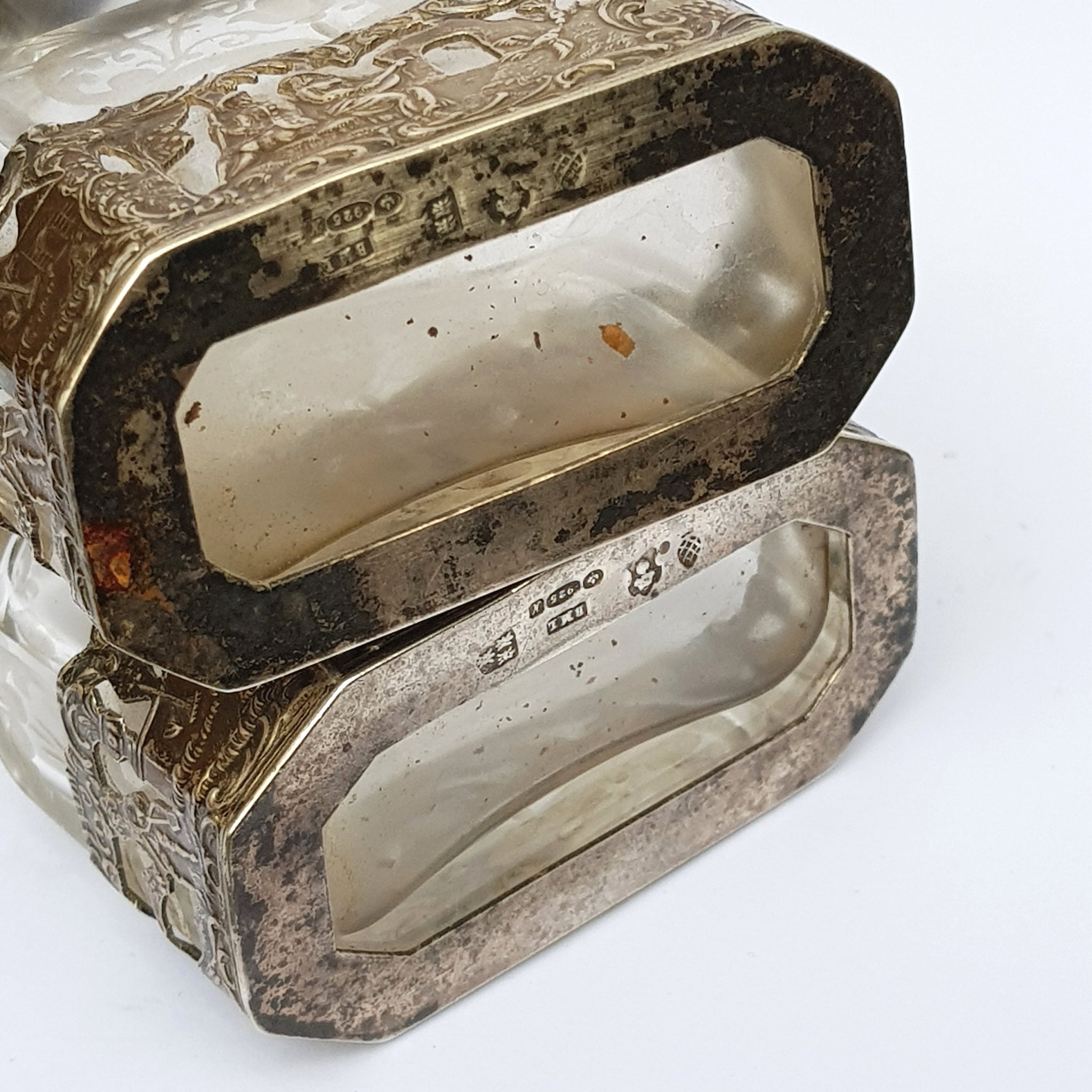 Each bottle with stopper in place stands 14.2 cm tall with a base with and breadth of 6.7 cm x 3.8 cm and each silver mount to the bottles is impressed with markings indicating 925 Sterling Silver, Chester Assay Office Import circa 1913 with the importers mark for Boaz Moses Landeck of Campden Square, London, also present is the Dutch Township mark for Breda and makers pictorial mark.
