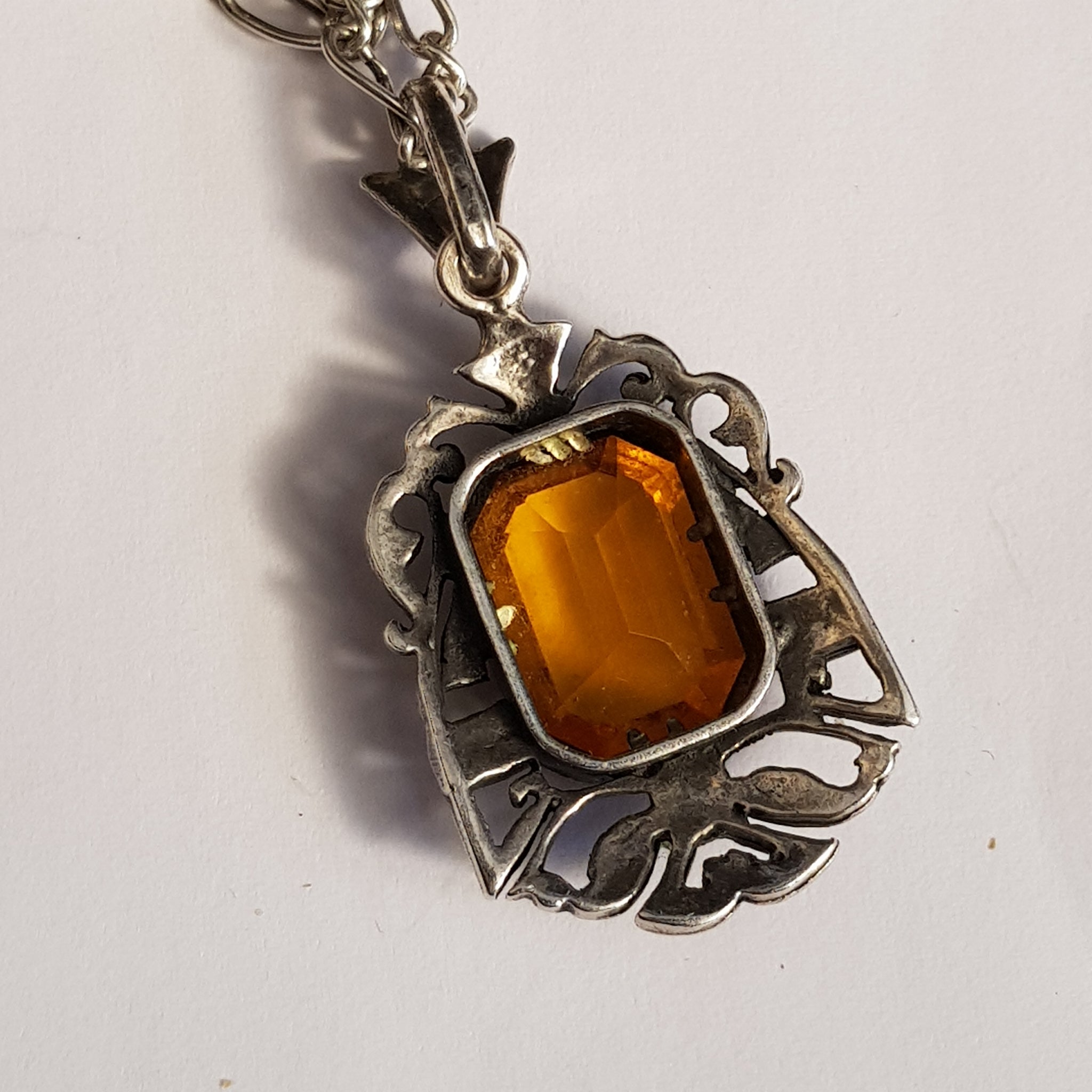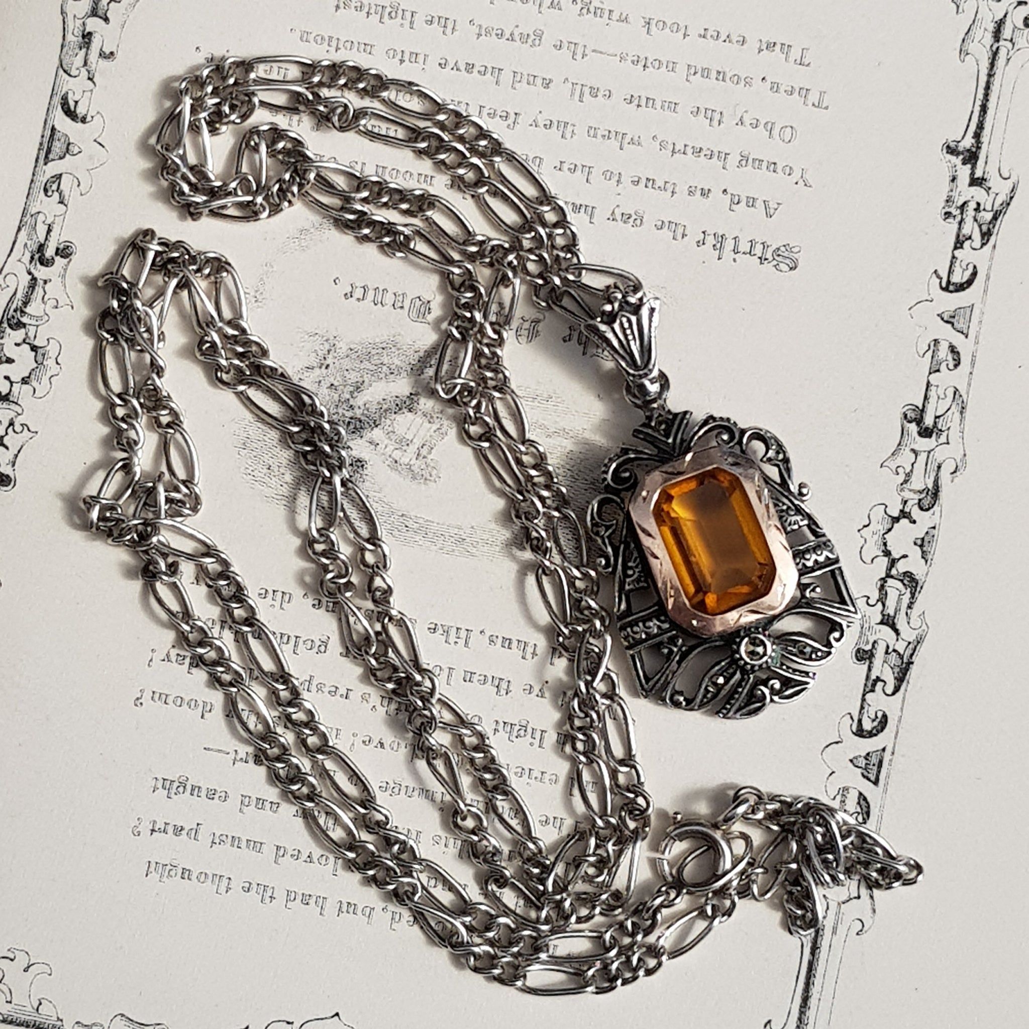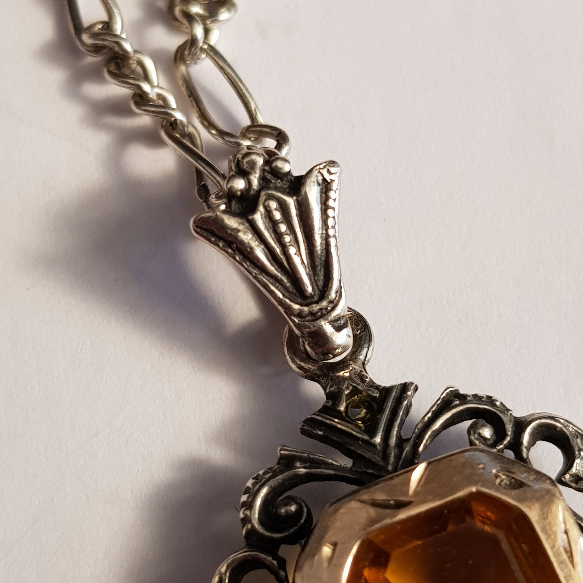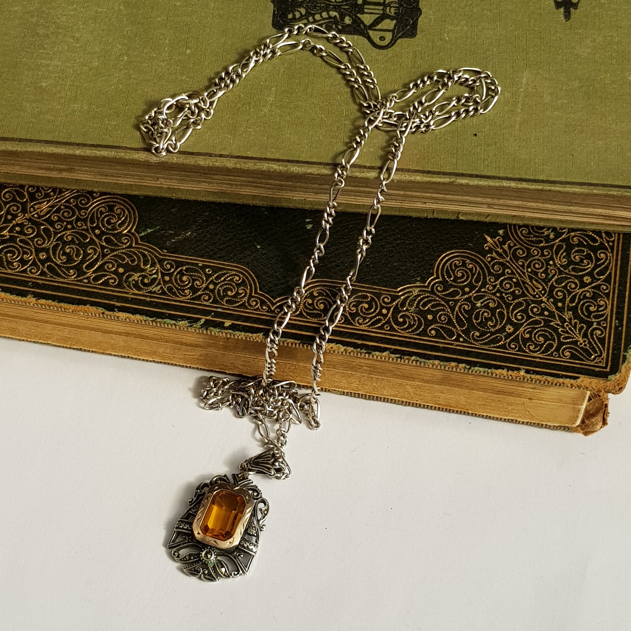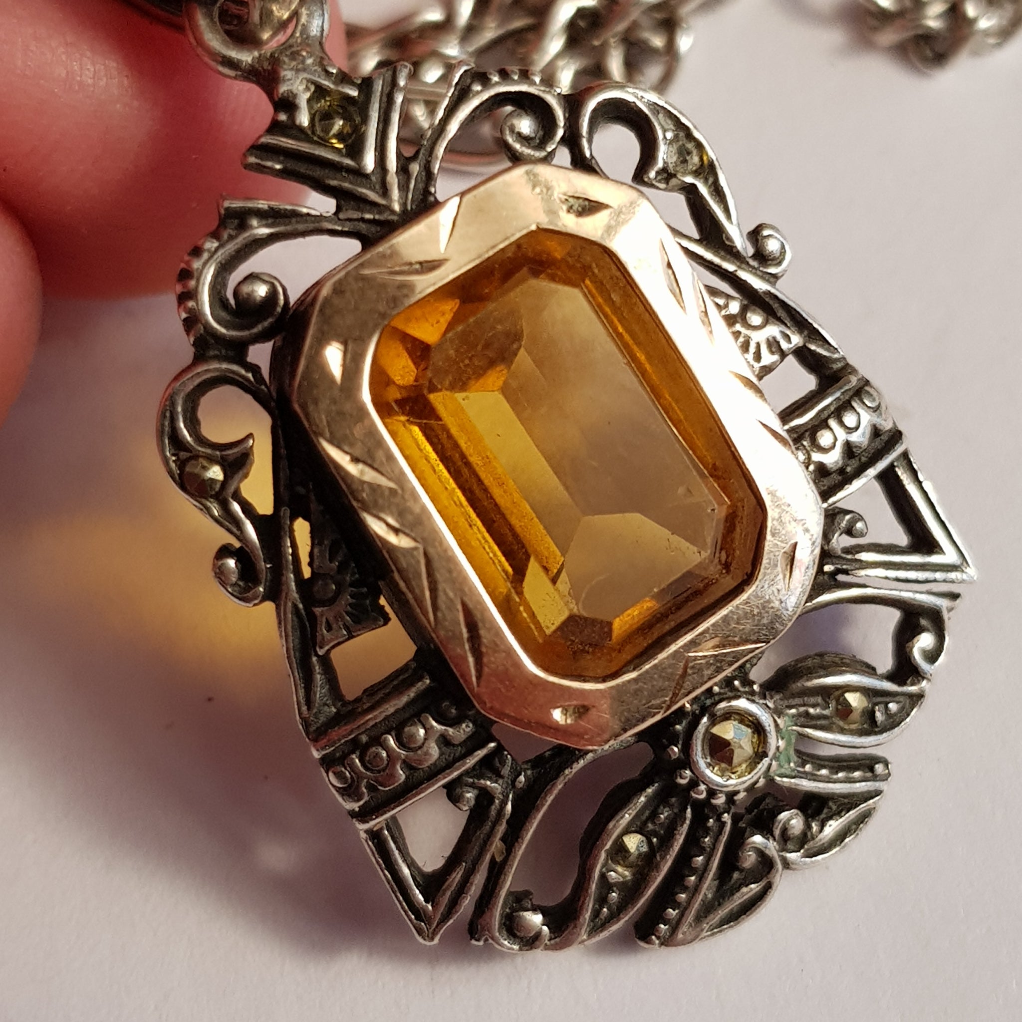Sterling Silver Gold Topaz Marcasite Pendant On Silver Chain Vintage Italy Circa 1970's