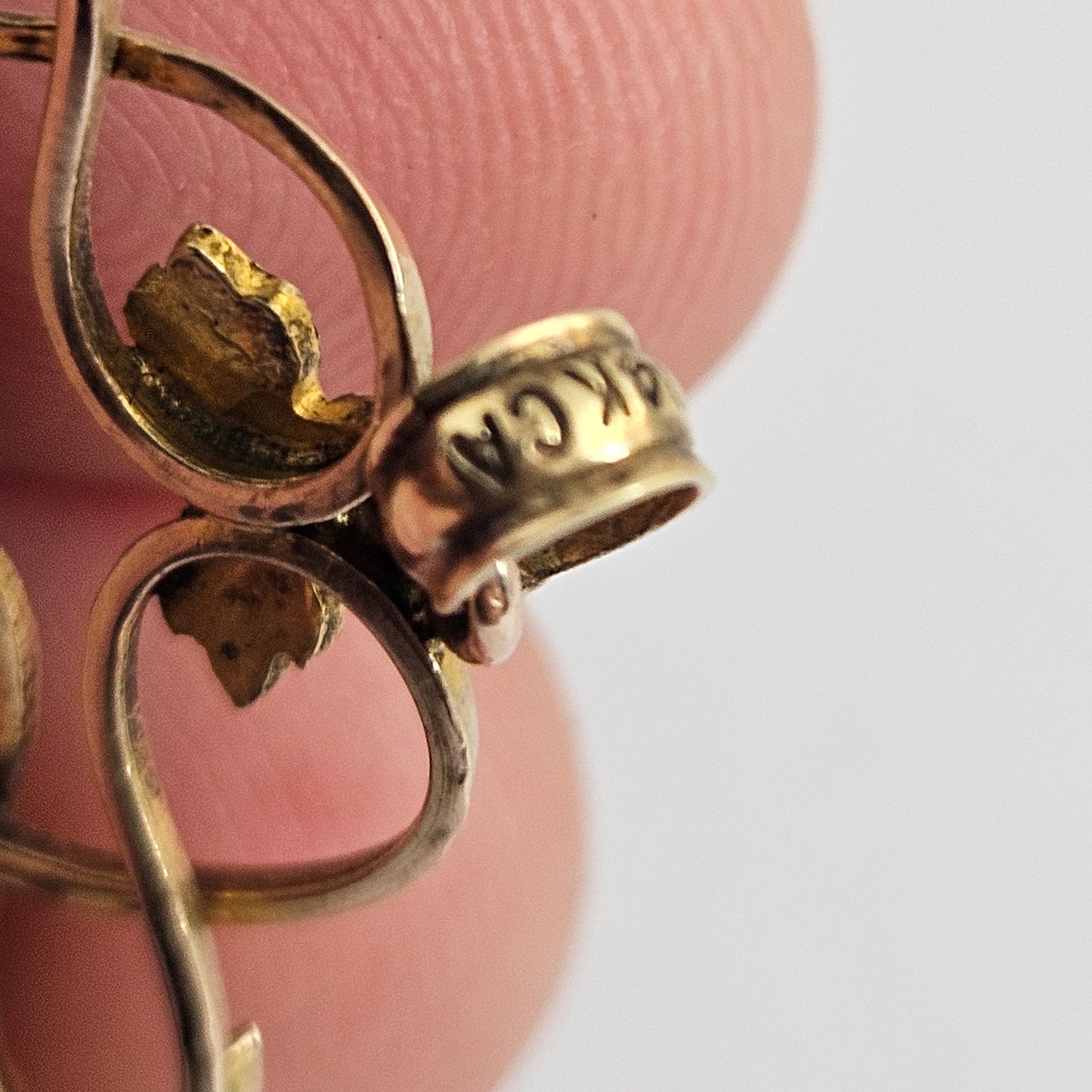 A striking Edwardian pendant embodying the spirit of the suffragette movement. This delicate piece features a harmonious blend of deep red garnet, vibrant peridot, and lustrous seed pearls set in 9k gold, creating the iconic tricolour symbolism of the cause. The gold is marked to the rear, the bale has been replaced and is marked for 14ct gold, there is also a makers mark 'H&W'. Some of the seed pearls have slightly darkened, please see the pictures. The dangling design catches light beautifully, showcasing the craftsmanship of the era. A meaningful piece of jewellery history with genuine antique character and timeless elegance.