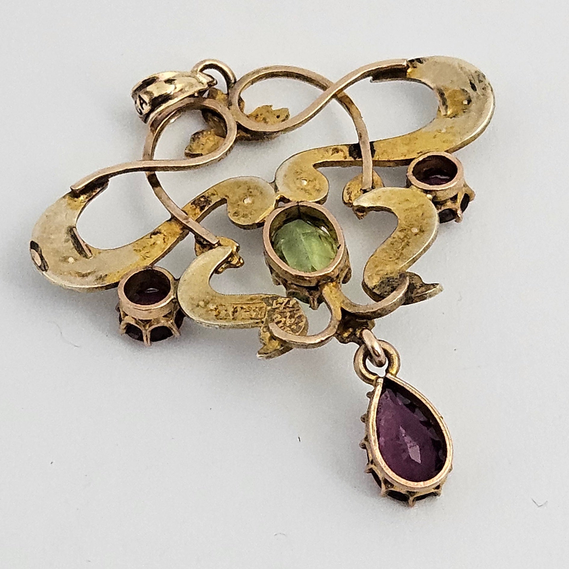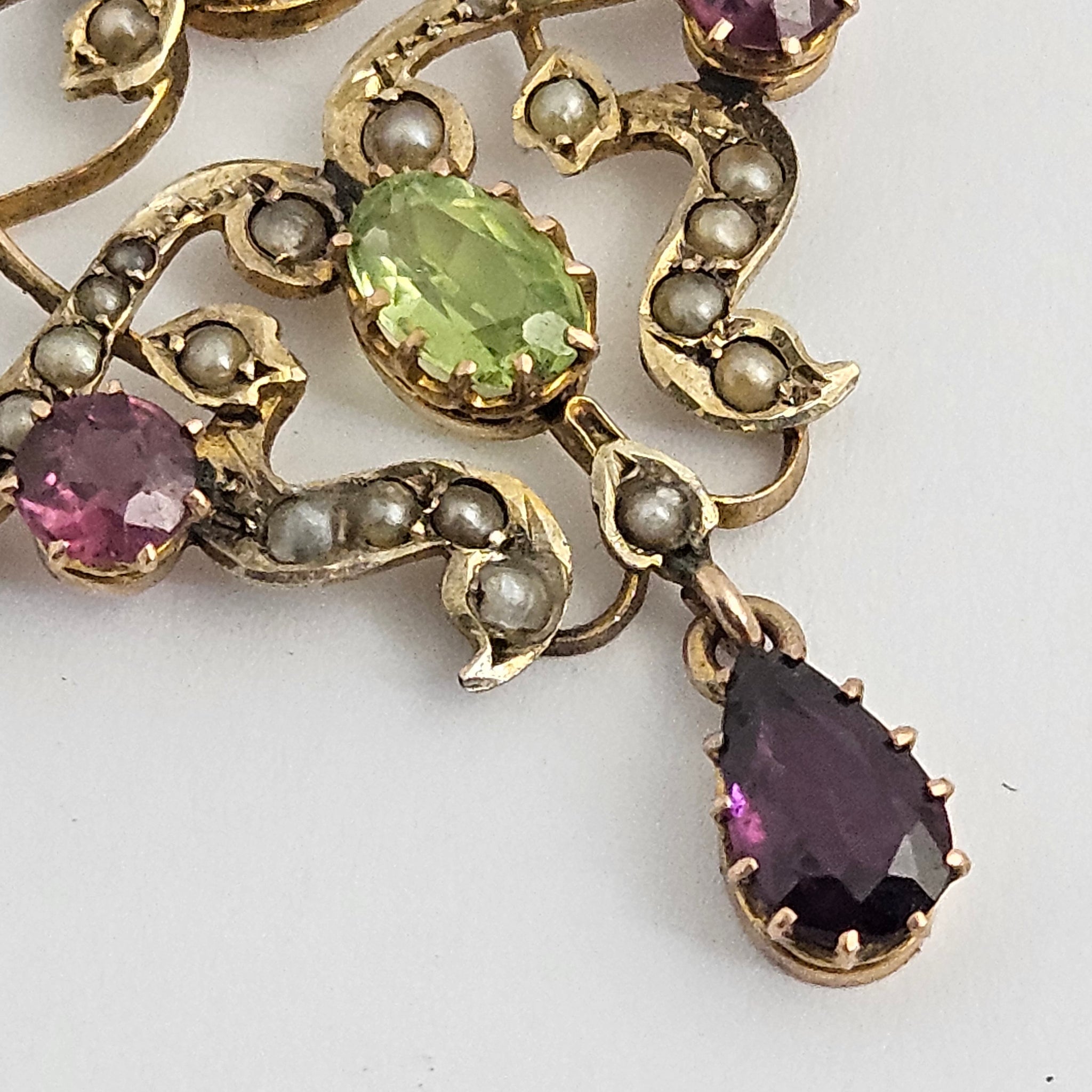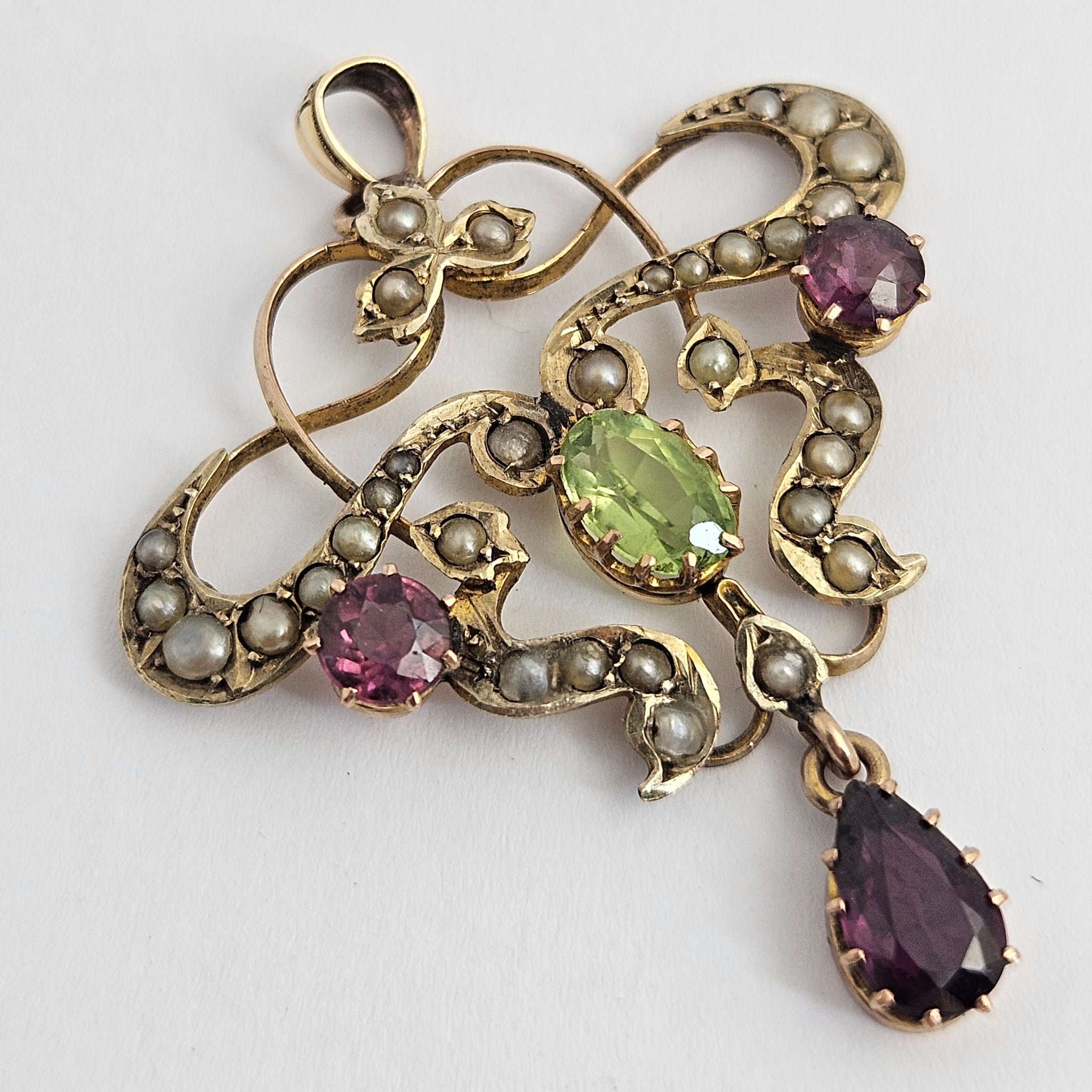 Suffragette Dangling Pendant Garnet Peridot and Seed Pearl in 9k Gold Antique Edwardian