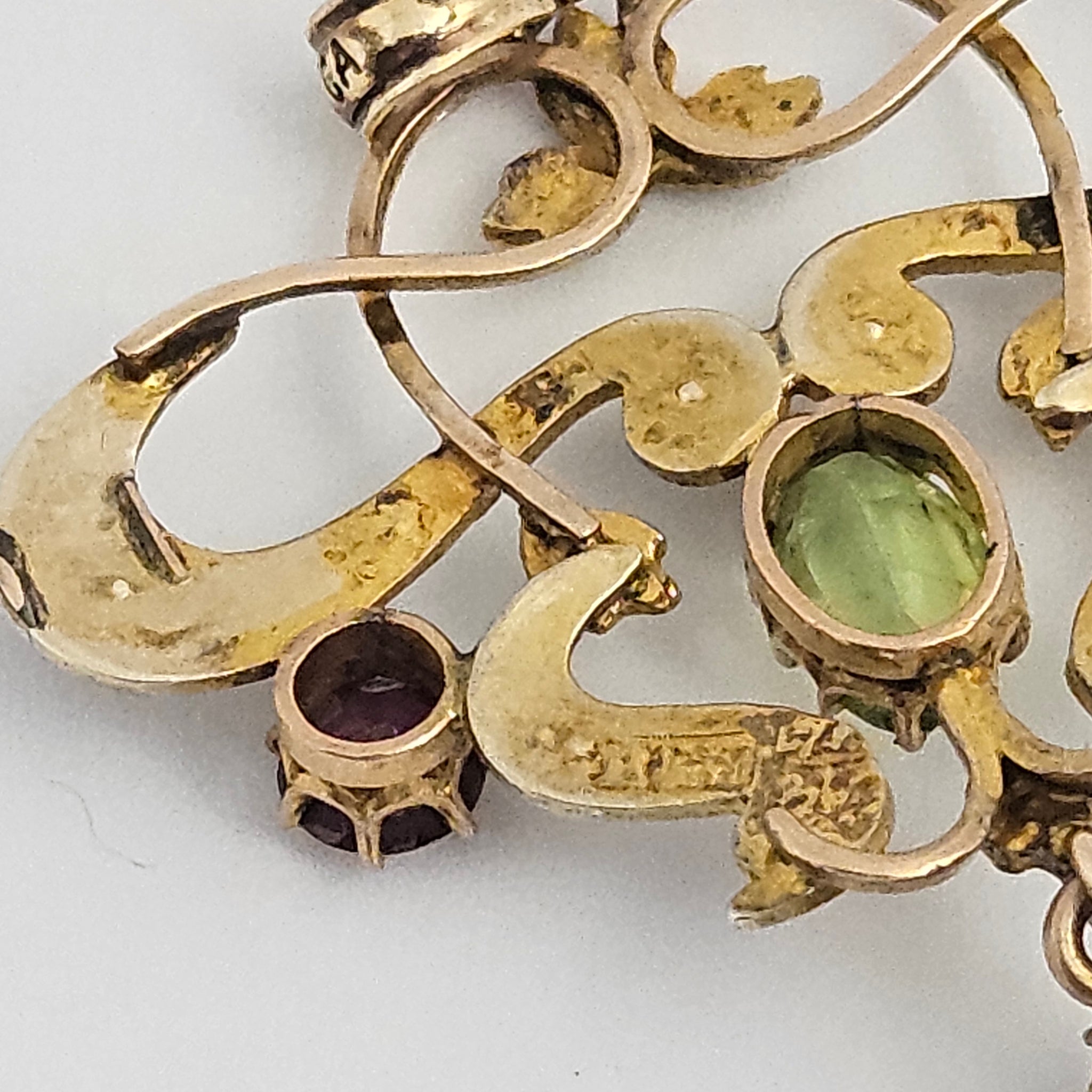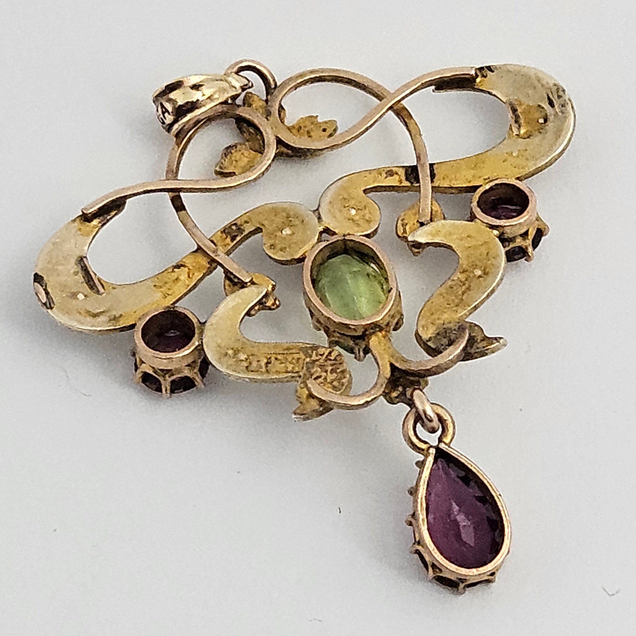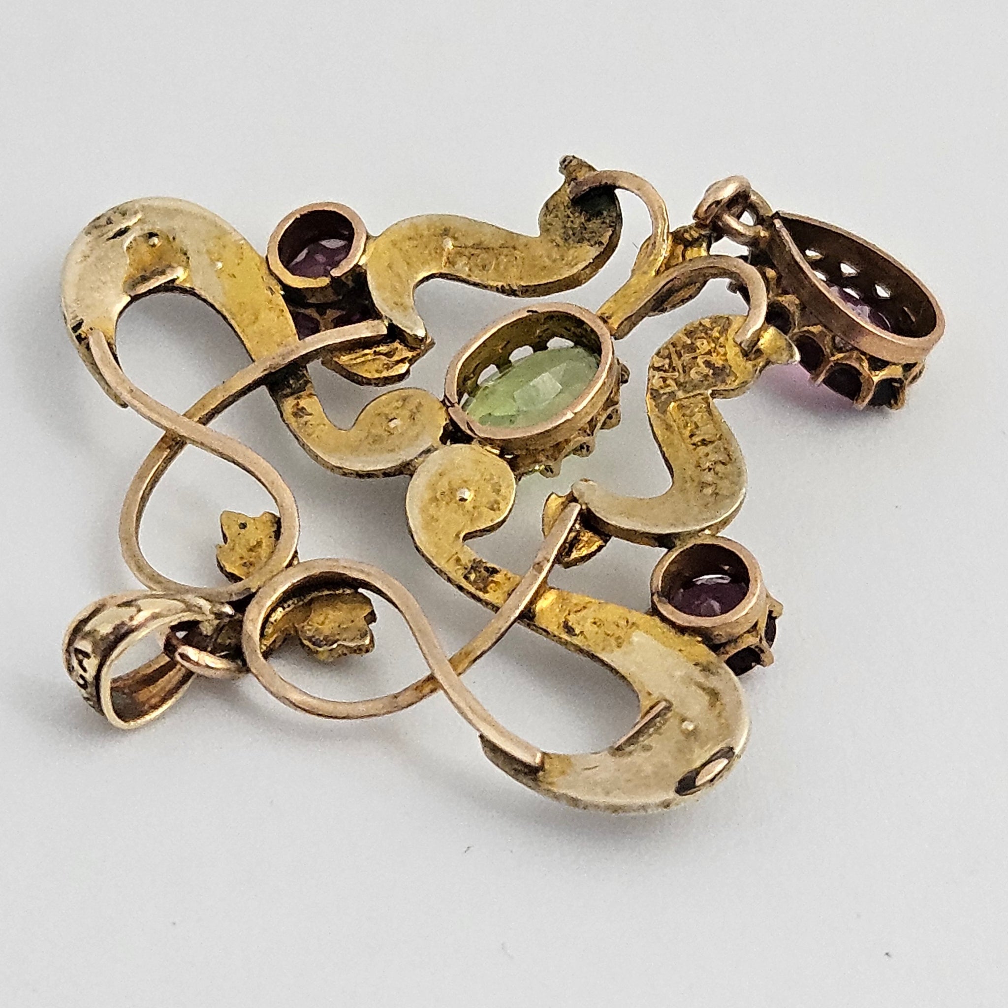 Suffragette Dangling Pendant Garnet Peridot and Seed Pearl in 9k Gold Antique Edwardian