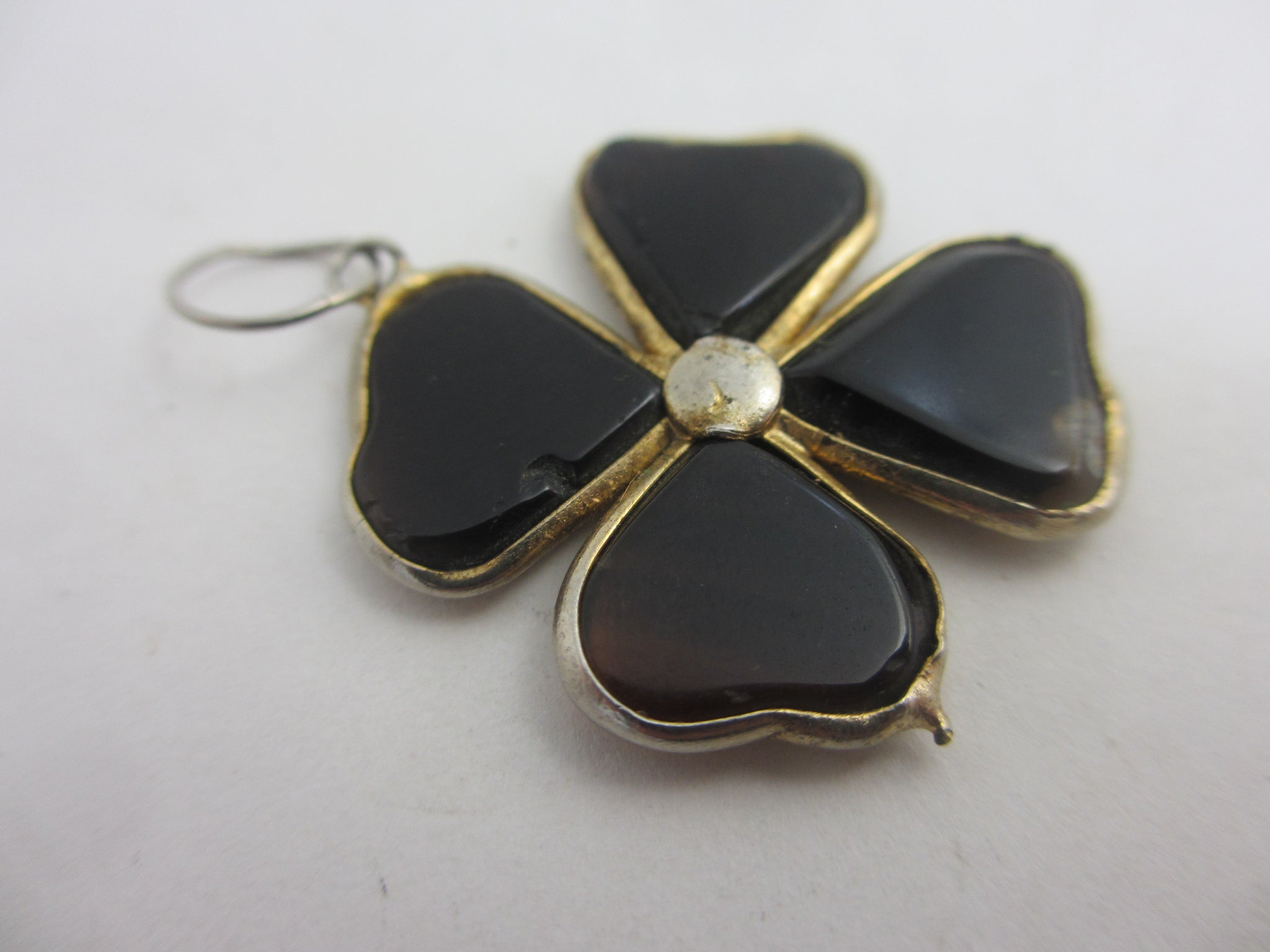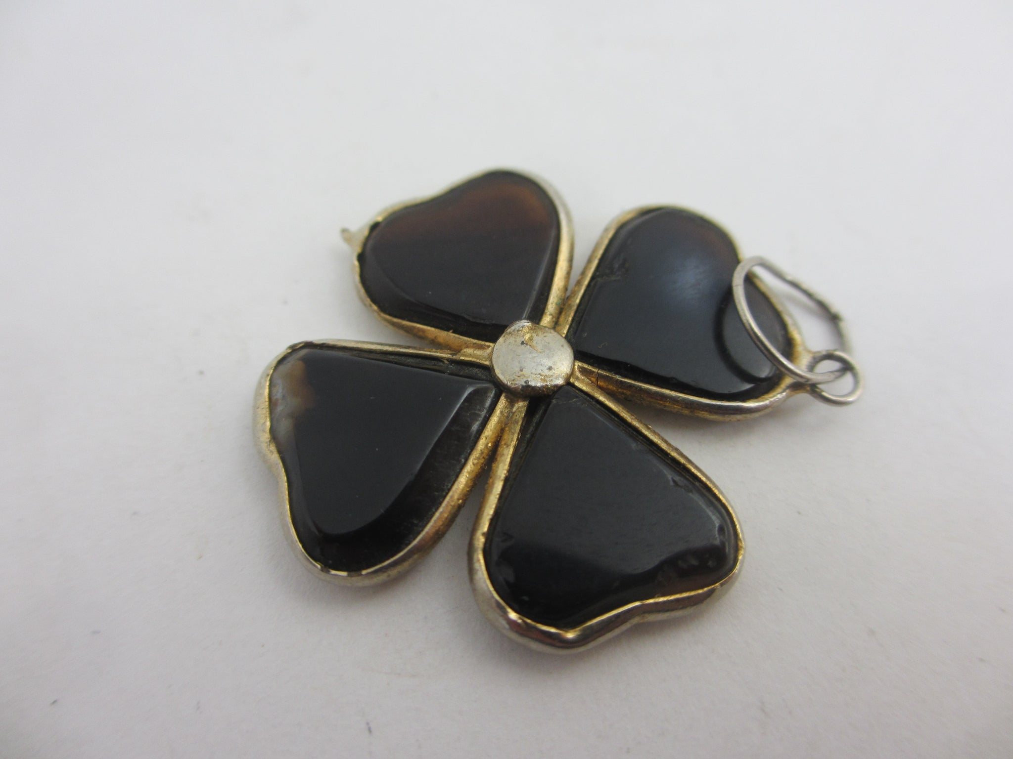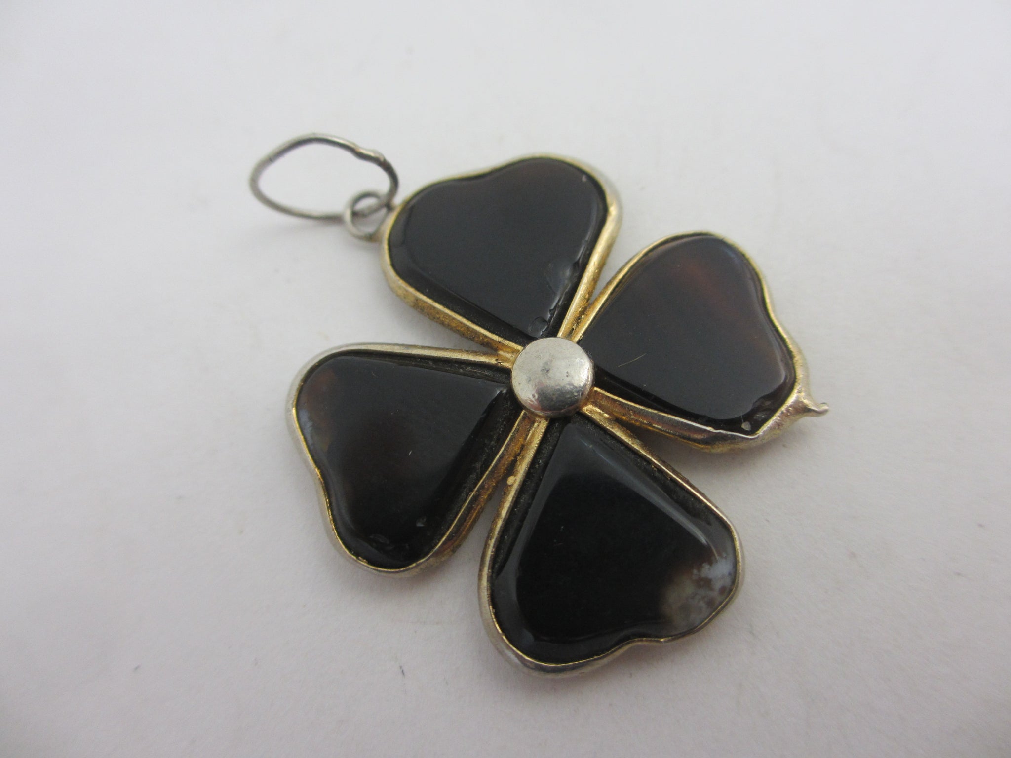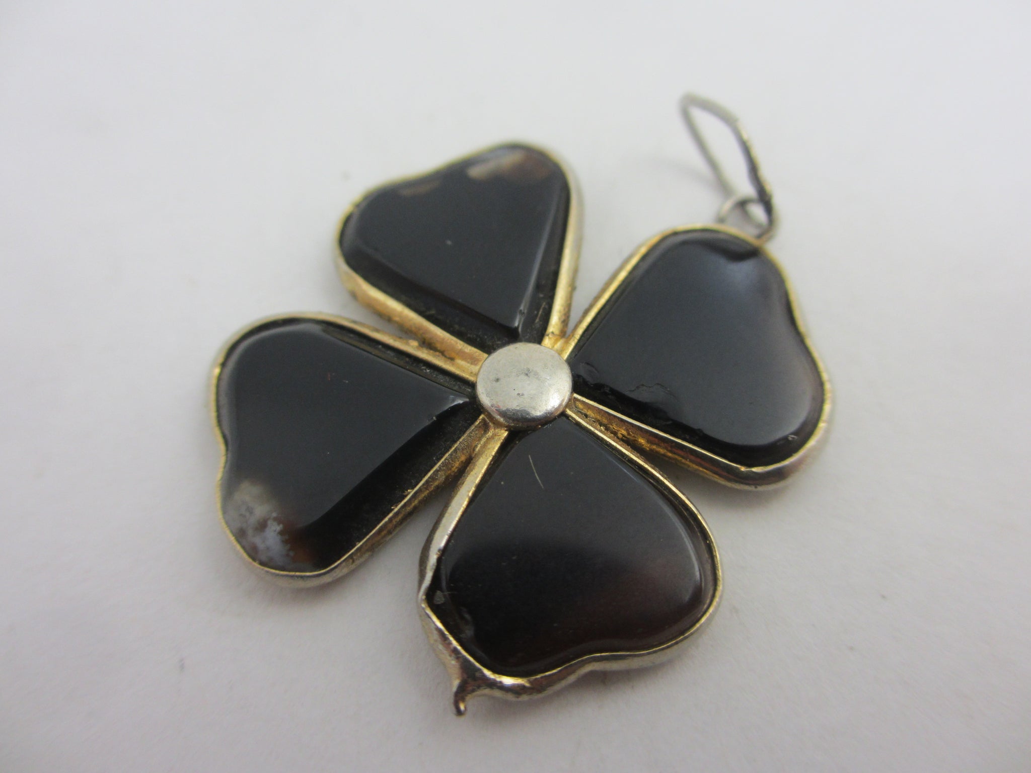 Fantastic dark stones to this lucky 4 leaf clover pendant dating from the Victorian period in sterling silver. The silver has been tested as there are no marks and there is a small nibble to one stone, please see the pictures. Perfect to bring good luck to the wearer.