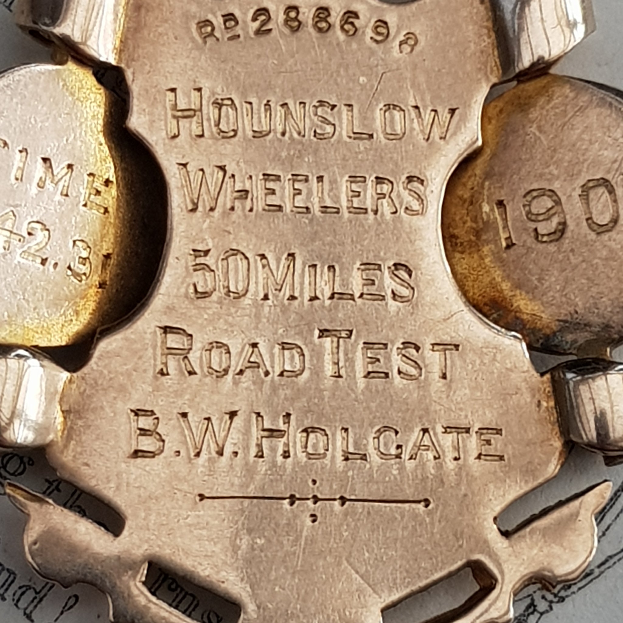 Featured as a traditional watch fob / medal the item is of an ornate design finished with a duo of Bicycle Wheels Flanking a central set raised Shield Cartouche and lower half Crown, the top of the medal has a terminating lug so as to serve for when securing to a watch chain or similar, the reverse to the fob is engraved with the unique legend relative to the recipient of the medal during the Edwardian period that reads "Hounslow Wheelers - 50 Miles Road Test - B.W Holgate" the flanking panels are legend engraved with the year '1905' and the recipients recorded time of '2hrs 32 mins 41 seconds'.