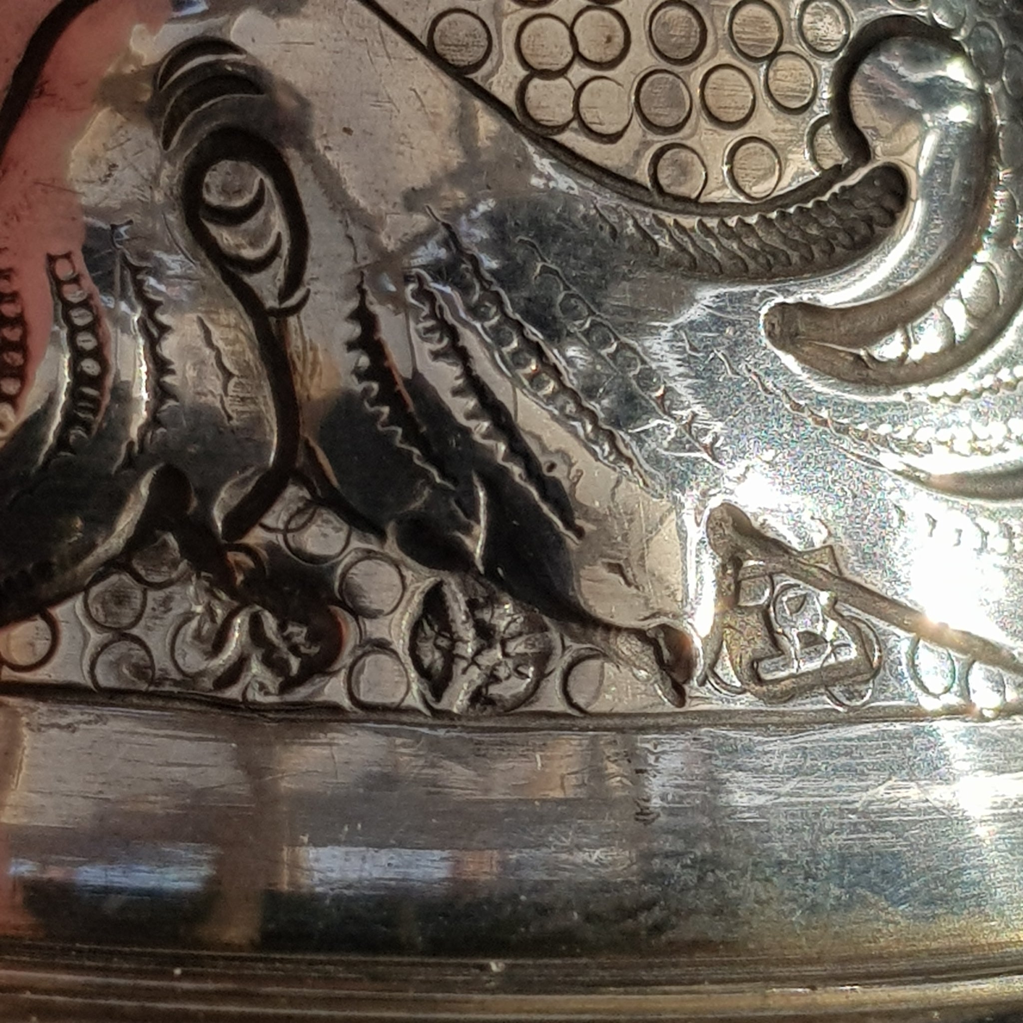 Antique Late 19th Century Lovely Quality Norwegian Silver marriage Cup in the traditional style featured as a Lady in with stylised Octopus arms terminating with Sea Serpent caryatids to a hinged tot cup in foliate repousse, the dress to the lady serves as a tapered drinking cup which is also repousse detailed with chased floral designs in a double strapped closed gallery.