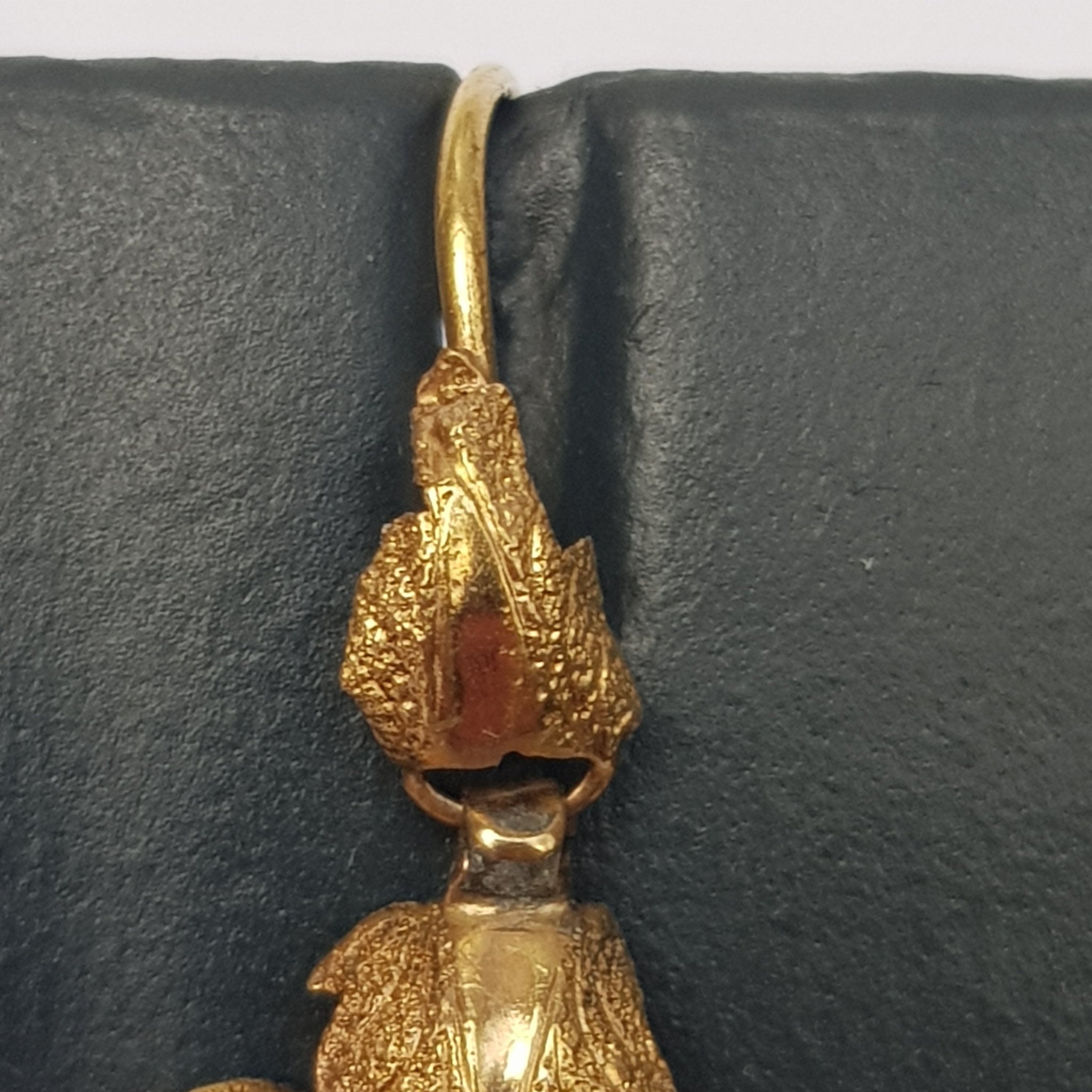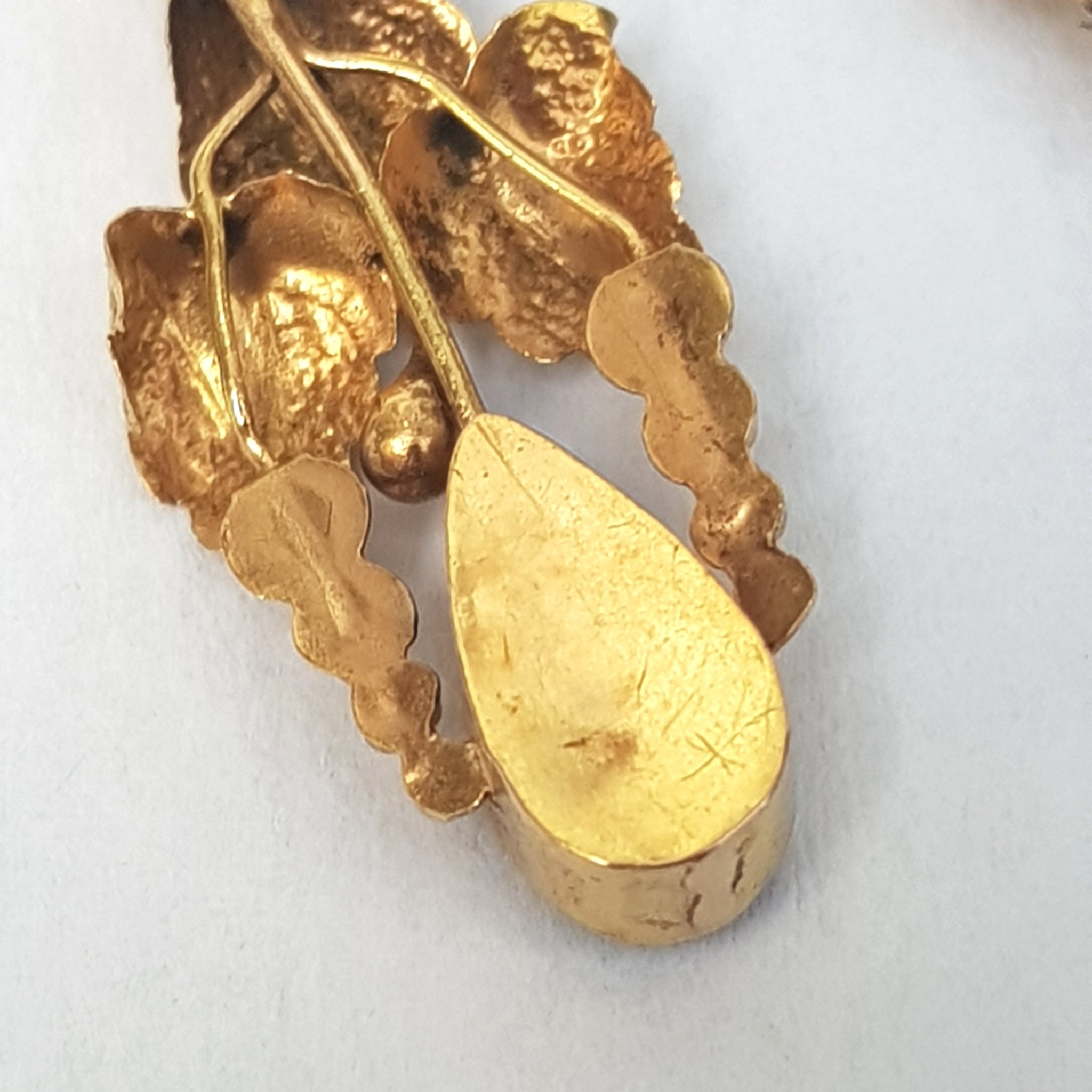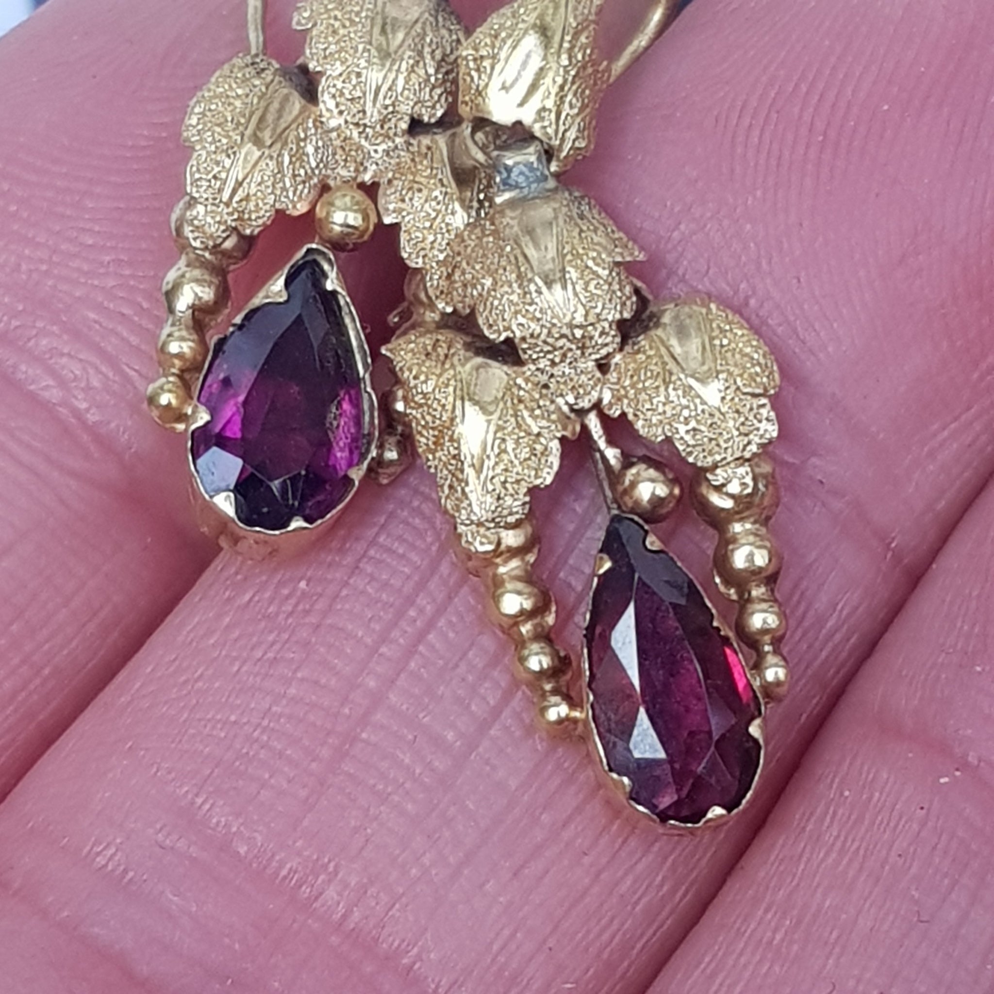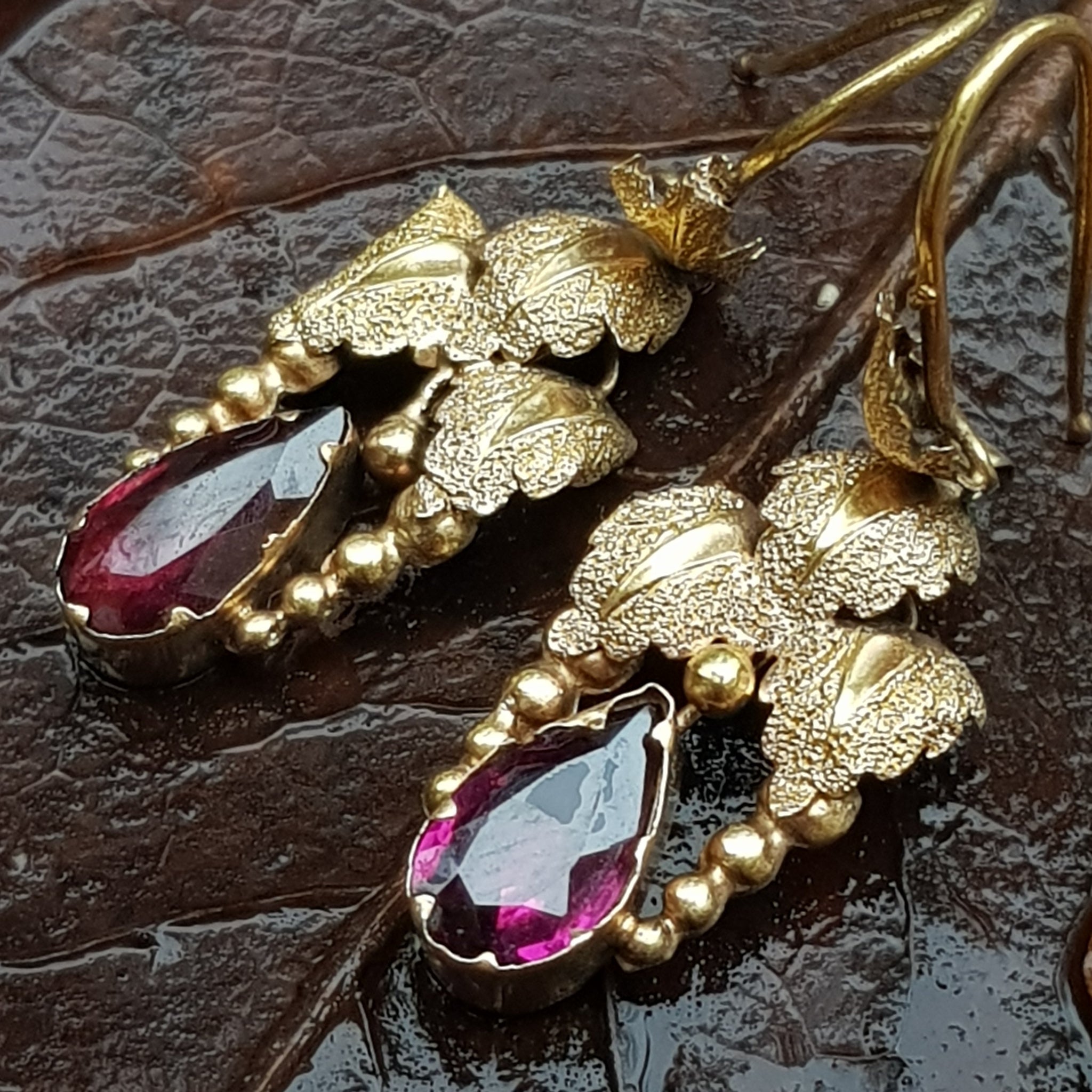 Antique Latter 19th Century Lovely Quality Pair of Artisan Jeweller made Drop Earrings in unmarked 14k Gold Set with Tear Drop Cut and faceted Almandine Garnets, each gemstone being solid blacked and claw clasp set housed within a Bacchanalian theme of Grapes and Leaves, the crown to each earring terminating with a secured ear hook so as to serve for when wearing with pierced ears upon the lobe.