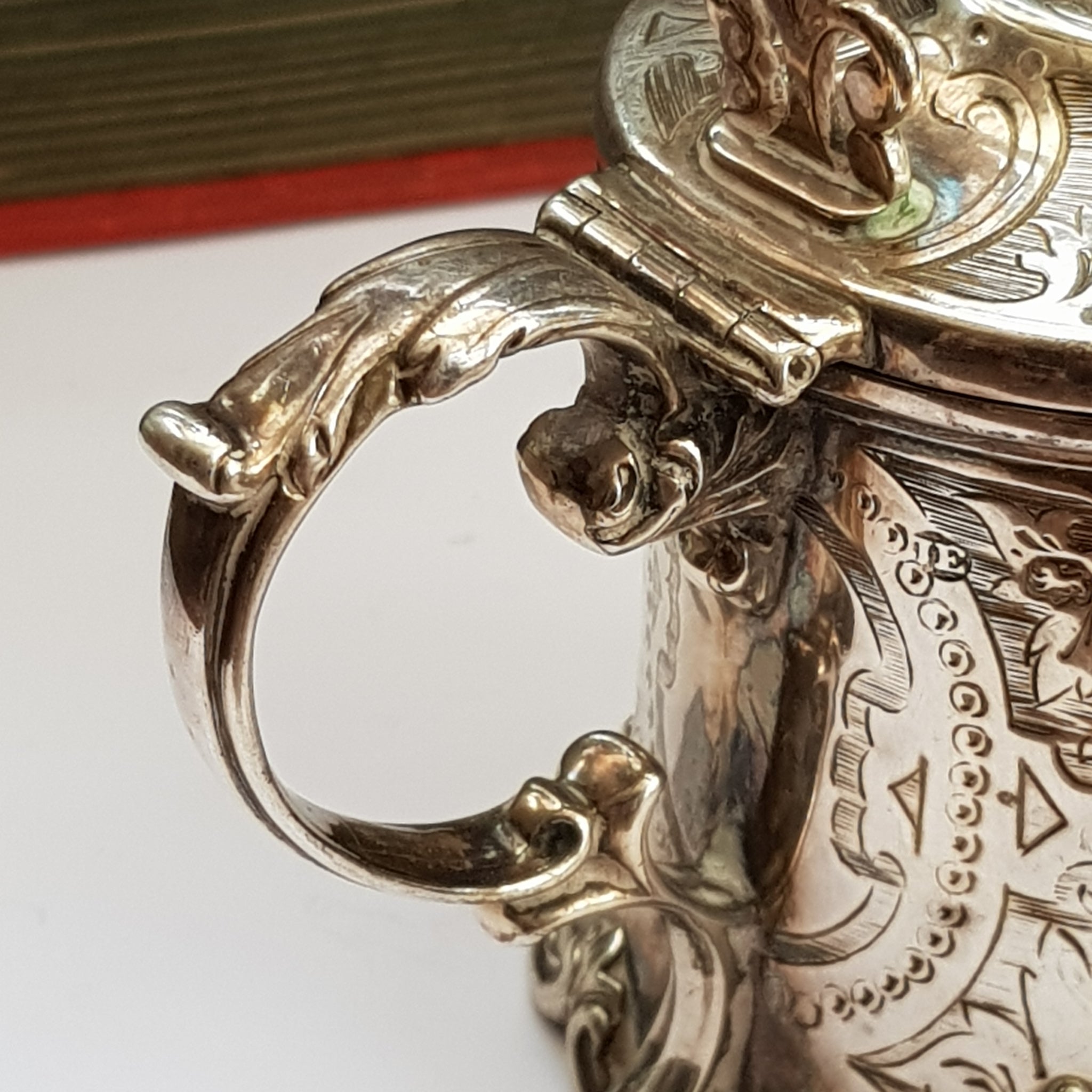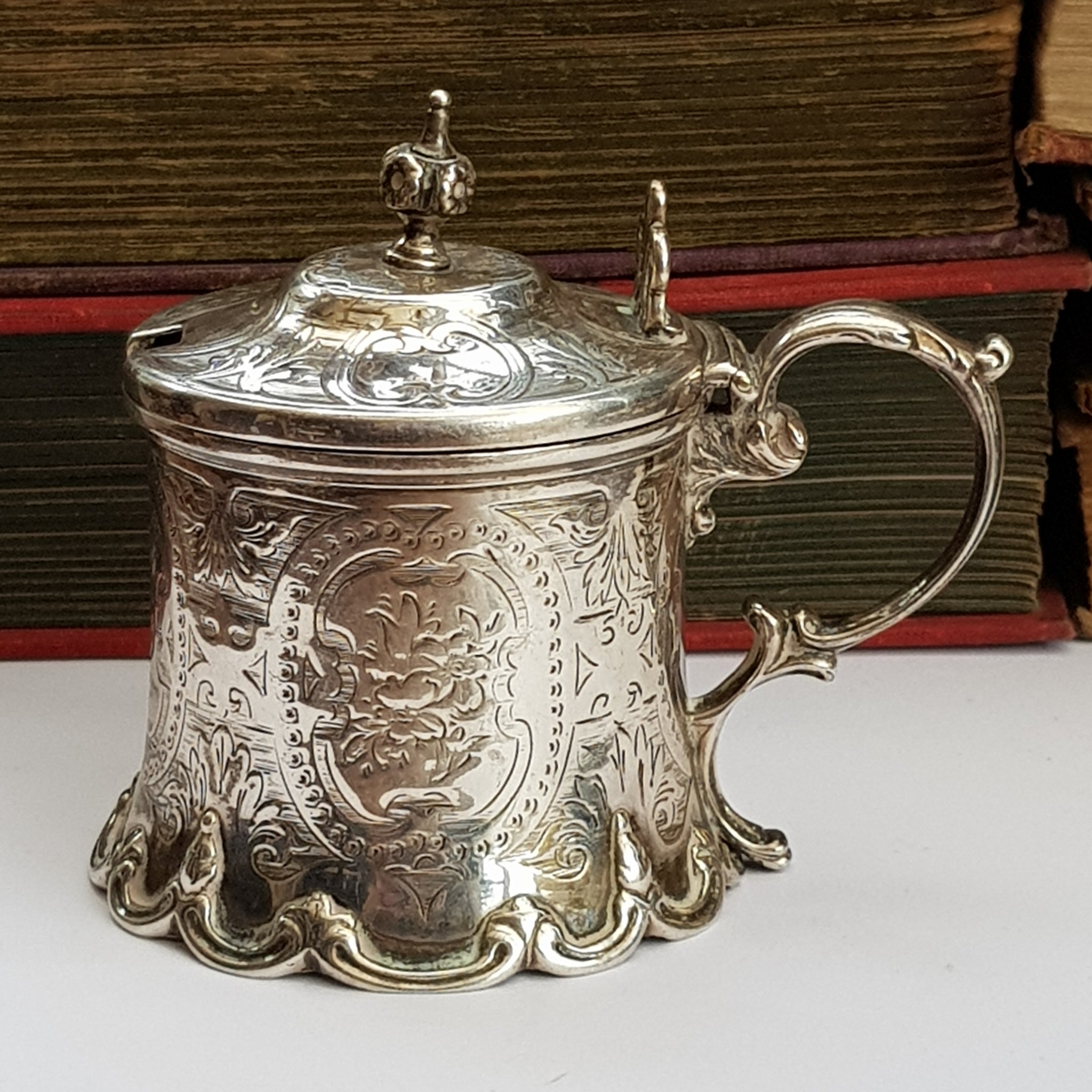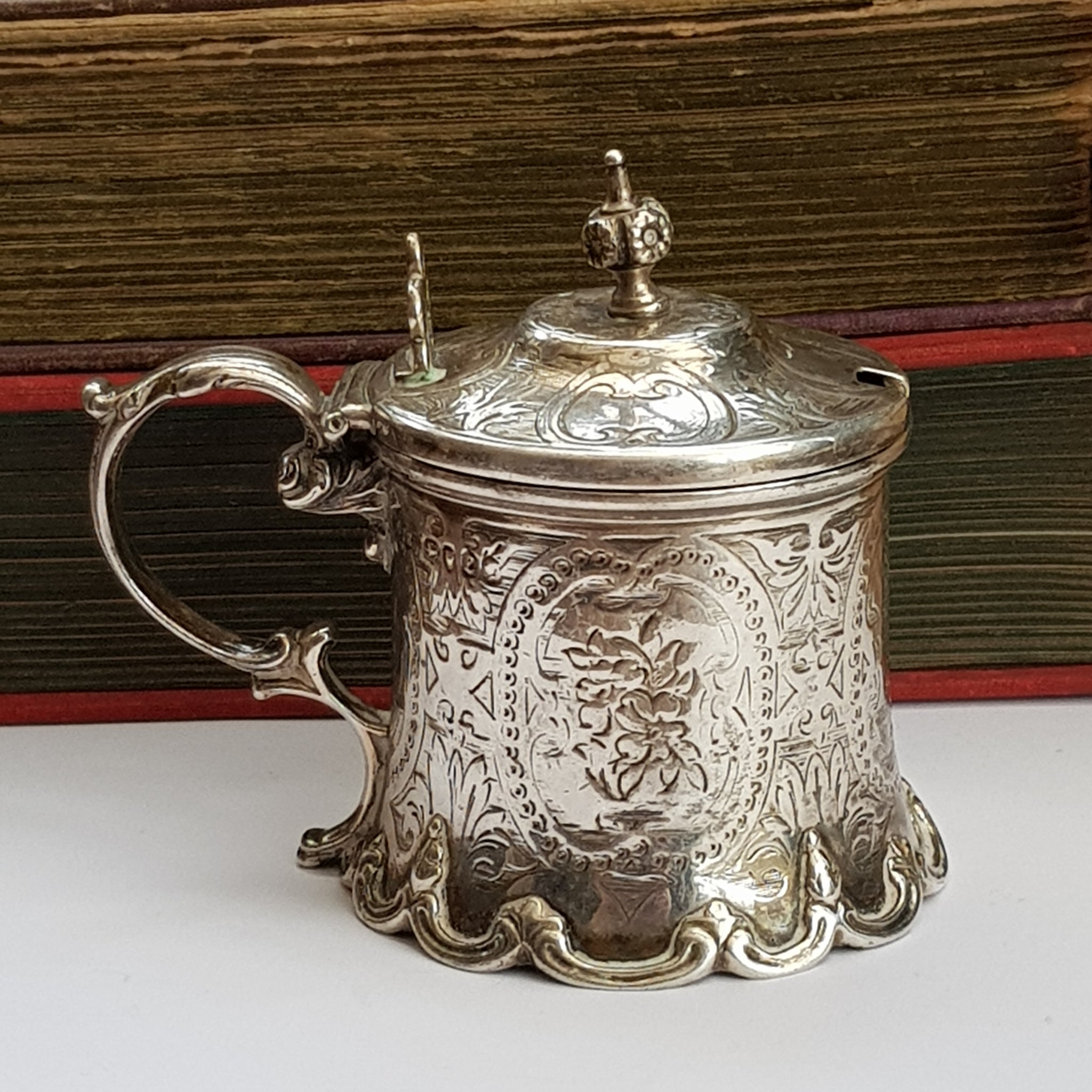 Antique early/Mid Victorian Period Top Quality Sterling Silver table Mustard Pot of an ornate and rather flamboyant design decorated to the body with a series of closed gallery frames, each detailed with a flower, the spaces between frames are detailed with chased designs including Fleur-Dy-Lys and fern, the bottom skirt to the mustard features a swag gallery raised lip and the body to the mustard is finished with a hinged, domed lid, similarly detailed as with the body, a pierce Fleur-Dy-Lys finger catch and central sceptre style lid finial, the handle to the mustard is foliate adorned and of a scroll arch pattern.