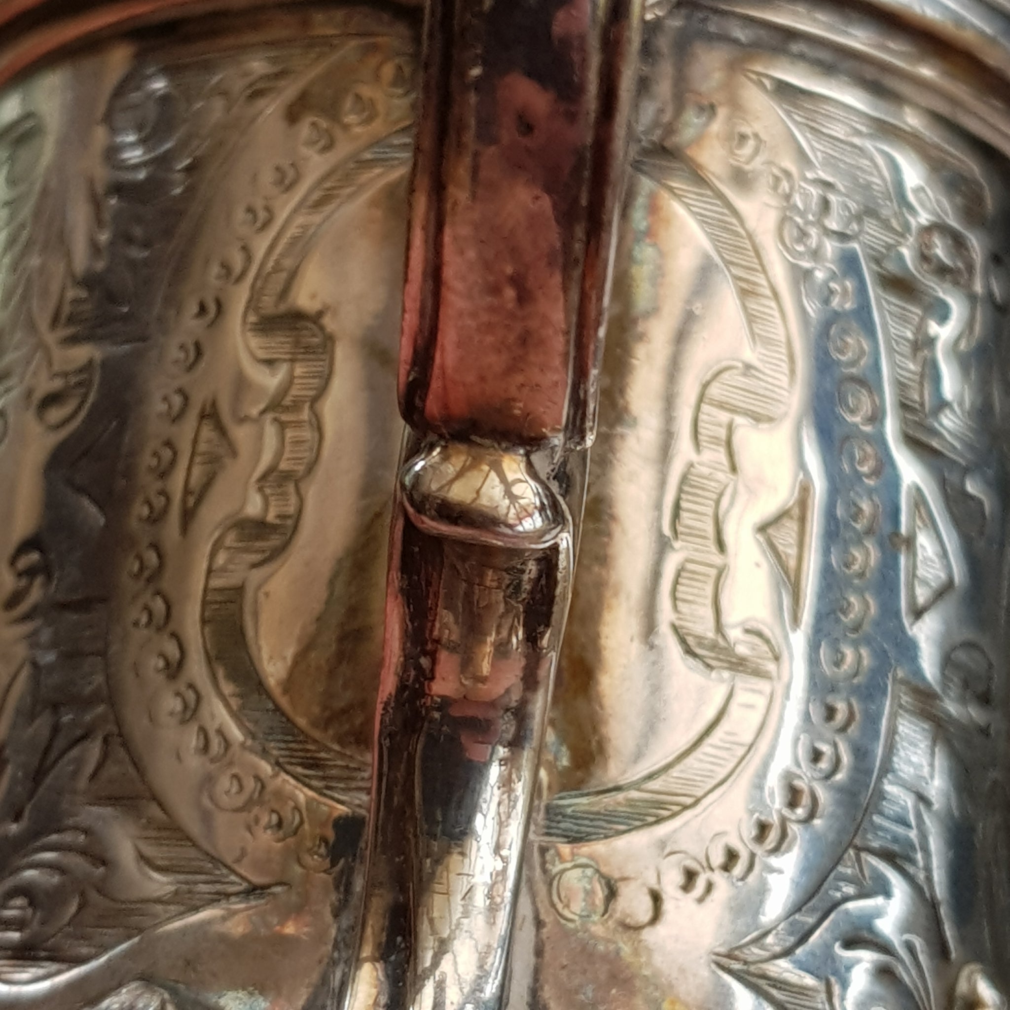 The mustard Pot is impressed to the shoulder with good clear markings indicating London assay office circa 1860 with the makers mark for John Evans II, also present is the Duty Mark for Queen Victoria.